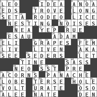 ACROSS 1. Lion 4. It may be bright or harebrained 8. Small Philippine buffalo 12. Begley and Asner 13. Collection of objects 14. Having great length 15. Stalk of a moss capsule 17. Cowboy competition 18. Louse (plural) 19. Snuggling 21. Annoying sounds 23. Teachers' org. 24. Slangy assent 26. Sorrow 27. Son of Isaac 28. First of billions? 30. Connecticut Ivy Leaguer 31. Raisin fruits 34. Opposite of masc. 37. 54 in ancient Rome 38. Make or become more lively 39. Alias (abbr.) 40. Observe 41. Spring feasts 42. Allow 43. Prong on a fork 44. Backtalk 46. Modern: prefix 47. Fast jet (abbr.) 50. Before (prefix) 51. Oak nuts 54. Flamboyance 57. Ear part 58. Laconic 60. Opening into or through something 62. Electrical Unit 63. A salt of uric acid 64. Bear (Spanish) 65. Toward shelter 66. Nathan's nickname 67. Lair DOWN 1. French article 2. Locale of original sin 3. Clearly or manifestly demonstrative 4. Literary sarcasm 5. Evade 6. First lady 7. Period of immesurable duration 8. Plant genus of onion and garlic 9. Annoying sound 10. At one time in the past 11. Grows older 13. Three (prefix) 16. At sea 20. The 19th letter of the Greek alphabet 22. Mouths or openings 25. Some stationery 27. Writer Wiesel 29. Lairs 30. Raised railways 31. Small, secluded valley 32. Amusement-park features 33. "___ Maria" 34. It jiggles the polygraph 35. Supplements with great effort 36. Floor covering 41. The Jewish people; Israel 43. Cigar-shaped 44. Health resort 45. Bowlike part 46. Having high moral qualities 48. Small fatty European fish 49. Clothes sense 51. Inventor's middle name 52. Calm and collected 53. Make senseless or dizzy 55. Born 56. Otherwise 59. Period 61. Period of immesurable duration