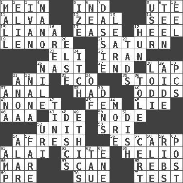 ACROSS 1. Count _ (2 wds.) 5. Indiana (abbr.) 8. Shoshoni 11. Inventor's middle name 12. Ardor 14. Perceive with the eye 15. Climbing, woody, usually tropical vines 17. Comfort 18. Person who is morally reprehensible 19. Poe poem 21. Titan orbits this 23. Biblical high priest 25. SW Asia republic 26. Political cartoonist Thomas 27. Conclusion 28. Pet locale 31. Cuckoo 33. Environmental prefix 35. Unemotional 37. Of or related to the anus 38. Possessed 40. Probability 41. Music written for nine 43. Opposite of masc. 45. Falsehood 46. Auto club (abbr.) 47. Binary compound 50. Connecting point 52. A single undivided whole 53. _ Lanka 54. Anew 56. Fortification 61. Jai ____ 62. Quote 65. Sun: prefix 66. Make imperfect 67. Examine hastily 68. Confederate soldiers (slang) 69. Before (prefix) 70. Take to court 71. Trial DOWN 1. Promenade 2. Writer Wiesel 3. _ the terrible 4. Billionth: prefix 5. Ending with capital 6. Teachers' org. 7. Hyrax 8. One who uses or employs something 9. Adolescent 10. Snakelike fish 13. Memorize 16. Type of rug 18. Attila the _ 20. Otherwise 22. Small boys 24. Hankering 26. "Death on the ____" 28. Farming town in central California 29. Assistant 30. Personal Computers (abbr.) 31. Small Philippine buffalo 32. Nanny 34. Clumsy lout 36. Lacquered or enameled metalware 37. Santa ___, CA 39. Lairs 42. Prong on a fork 44. Greater amount 48. Flat circles 49. Value system 51. Food container 52. RI univ. 54. Having or resembling wings 55. Conductor's collection 57. Certainty 58. Toward shelter 59. Teases 60. Mail 61. Electrical Unit 63. The 19th letter of the Greek alphabet 64. Compass dir.