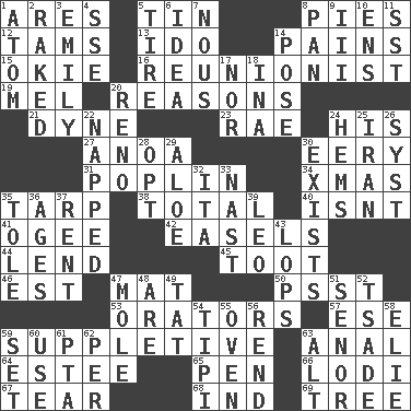 ACROSS 1. Ancient Greek god of war 5. Metal container 8. Sliced desserts 12. Scottish caps 13. Wedding promise 14. Aches 15. Migrant worker of the '30s 16. One who advocates reunion 19. Cartoonist voice _ Blanc 20. Thinks logically 21. Unit of force 23. Actress Charlotte 24. Part of HMS, perhaps 27. Small Philippine buffalo 30. Suggestive of the supernatural 31. Cotton for raincoats, e.g. 34. Dec. holiday 35. Canvas cover 38. "_____ Recall" 40. Is not 41. Double curve, resembling the letter S 42. Artist's stands 44. Grant temporary use of 45. A blast of a horn 46. Eastern Standard Time (abbr.) 47. Floor protector 50. Inconspicuous attention getter 53. Speakers 57. Compass dir. 59. Supplying deficiencies 63. Of or related to the anus 64. First name in cosmetics 65. Animal enclosure 66. Farming town in central California 67. Separate forcefully 68. Working for oneself (abbr.) 69. Relationship diagram DOWN 1. Smallest unit of an element 2. Swept the length of 3. Poet Dickinson 4. Compass dir. 5. Hoop that covers a wheel 6. The content of cognition 7. Good sense 8. Baking dish 9. One more than two 10. Followers of ems 11. Fast jet (abbr.) 14. Airs 17. And not 18. _ tizzy (2 wds.) 20. Western Nevada city 22. Slept 24. Is hesitant and indecisive 25. SW Asia republic 26. System (abbr.) 28. Choose 29. _ vera 30. Is 32. Call ___ day 33. Political cartoonist Thomas 35. Lacquered or enameled metalware 36. Ripens 37. Monthly bill 39. Lion 43. Chops off 47. Undercover agent 48. "We ___ not amused" (Victoria) 49. Make lace 51. Sir (Sp.) 52. Sadhe (variant) 54. Native american tent (variation) 55. Baking chamber 56. Tear apart 58. Writer Wiesel 59. Put into a specified state 60. Purpose 61. Parent Teacher Association (abbr.) 62. For each 63. The first octave above the treble staff