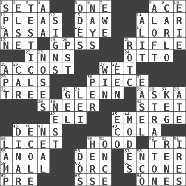 ACROSS 1. Stalk of a moss capsule 5. Single 8. Adept person 11. Entreaties 13. Obsolete 14. Having or resembling wings 15. Slender Brazilian palm 16. Sight organ 17. Australian parrot (variant) 18. Remaining after all deductions 19. Global Positioning Systems (abbr.) 21. Firearm 22. Taverns 24. "Beetle Bailey" pooch 25. Buttonhole 27. Soggy 29. Friends 30. Component 32. Family _ (genealogy) 33. American astronaut and politician John 35. "____ silly question..." 39. Contemptuous expression 41. Proofreading order 42. Biblical high priest 43. Develop 45. Cub Scout units 48. Root beer relative 49. It is permitted: Lat. 50. Parka part 52. Three (prefix) 55. Small Philippine buffalo 56. Lair 57. Keyboard key 59. Shopping center 60. The grampus (Milton) 61. Biscuitlike quick bread 62. Before (prefix) 63. Compass dir. 64. Singles DOWN 1. Connect, as a bridge 2. Otherwise 3. One of the two male reproductive glands 4. Auto club (abbr.) 5. Lyric poems 6. Negative votes 7. She-sheep 8. At or to great height 9. Monte _, Las Vegas Hotel/Casino 10. One of the Great Lakes 12. Public displays of written messages 14. Set down 20. Pacific Standard Time (abbr.) 21. College mil. group 23. Olfactory organs 25. Fitting 26. Automobile 27. Victory 28. Car or cant ending 30. For each 31. Artist's stand 33. Set 34. Flowery wreath 36. Ski resort town in Vermont 37. Barrel 38. Had dinner 40. Egg locale 43. Environmental prefix 44. Methods 45. Middle Eastern gold or silver currency 46. Learning spot: Fr. 47. Be tempered by heat 49. Desk light 50. Possessive pronoun 51. Single time 53. French philosopher Descartes 54. Angers 56. Two (Sp.) 58. Non-commissioned officer (abbr.)