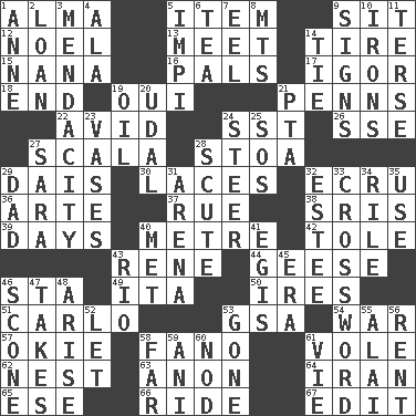 ACROSS 1. _ mater 5. A whole individual unit 9. Be seated 12. Christmas carol 13. Confront 14. Hoop that covers a wheel 15. Grandmother 16. Friends 17. Composer Stravinsky 18. Conclusion 19. Fr. "Yes" 21. Actor Sean's family 22. Enthusiastic 24. Fast jet (abbr.) 26. Compass dir. 27. Any of the three canals of the cochlea 28. Portico 29. Raised platform 30. Shoestrings 32. Shade of tan 36. Johnson of "Laugh-In" 37. Sorrow 38. Indian titles of respect 39. 24-hour periods 40. Distance measurement (Brit.) 42. Lacquered or enameled metalware 43. French philosopher Descartes 44. Honkers 46. R.R. building 49. Call ___ day 50. Angers 51. Monte _, Las Vegas Hotel/Casino 53. Girls' org. (abbr.) 54. Armed conflict 57. Migrant worker of the '30s 58. Papal veil 61. Short-tailed, large-bodied rat 62. Egg locale 63. At once, immediately (arch.) 64. SW Asia republic 65. Compass dir. 66. Travel on or in a vehicle 67. Prepare for publication DOWN 1. Queen of England 1702-14 2. Grant temporary use of 3. Ananias' fault 4. Insect wing 5. Body of Kaffir warriors 6. Afternoon social gathering 7. Snakelike fish 8. Mountains (abbr.) 9. Attaches a signature 10. Metal shackles 11. Laconic 14. Neckwear 19. Petroleum 20. Hereditary estate 21. Parent Teacher Assoc. 23. Flower holders 24. Guide 25. Mayday 27. "Two Mules for Sister ____" 28. Snake scale 29. Male parent 31. Sports stadium 32. First name in cosmetics 33. What you're doing now 34. Cause heat under the collar 35. Purpose 40. Was introduced to 41. The front part of a cuirass 43. _ de Janeiro 45. Epoch 46. Biscuitlike quick bread 47. Receives possession of 48. Get up 52. Allow 53. Went 55. Mountain range southwest of Kyrgyzstan 56. Monthly bill 58. At a great distance 59. Cuckoo 60. Dreamland 61. Compete