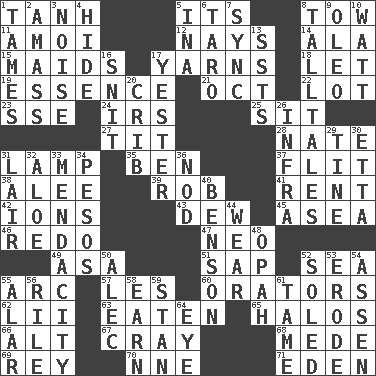 ACROSS 1. Hyperbolic tangent 5. ___ a Wonderful Life 8. Pull behind 11. Mine, in Marseilles 12. Negative votes 14. According to 15. Unmarried girls 17. Tall tales 18. Allow 19. Substance 21. Sep. follower 22. Car dealer's back yard 23. Compass dir. 24. Big collection agency 25. Be seated 27. Teat (slang) 28. Nathan's nickname 31. Desk light 35. Benjamin's nick name 37. Secret move to avoid paying debts 38. Toward shelter 39. Director Reiner 41. Monthly bill 42. Charged particles 43. Morning condensation 45. Toward the sea 46. Do over again 47. Modern: prefix 49. White ___ sheet 51. Plant excrement 52. Ocean 55. Curve 57. French article 60. Speakers 62. Cards in a Roman deck? 63. Ingested 65. Rings 66. The first octave above the treble staff 67. Supercomputer manufacturer 68. Ancient Persian 69. Marina Del _, California 70. Compass dir. 71. Paradise DOWN 1. Makes less strong or intense 2. Collect or gather 3. Annoying sound 4. Flintstone garb 5. _ tizzy (2 wds.) 6. Pacific island yam 7. Synchronize (abbr.) 8. Baron Munchausen's specialties 9. Butter sub 10. Electrical Unit 13. Fast planes 16. In a ____ (agitated or irritated) 17. Of or pertaining to yesterday 20. Baby bed with high sides 26. Kind of red light 29. Prong on a fork 30. Singer James 31. Den 32. Medicinal plant 33. Ananias' fault 34. Mexican monetary units 36. Dreamland 40. Gillaume's butler role 44. Put on (as clothing) 48. Brightly colored fish 50. Actor Baldwin 52. Having a sole or soles 53. Wear away 54. NE Netherlands city 55. Having or resembling wings 56. Cause heat under the collar 58. Merit 59. Comedian Laurel of Laurel & Hardy 61. Docile 64. Sight organ
