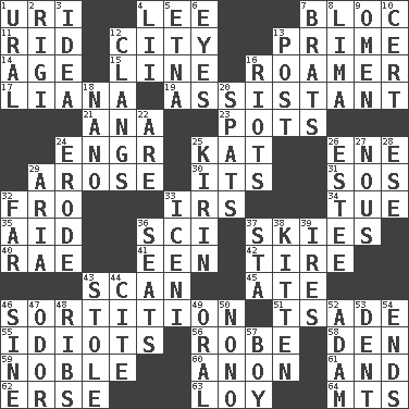 ACROSS 1. RI univ. 4. Area sheltered from the wind 7. Group of countries in special alliance 11. To free from 12. Municipality 13. First class 14. Mature 15. Actor's bit 16. Nomad 17. Climbing, woody, usually tropical vines 19. Aide 21. Santa ___, CA 23. Plant holders 24. Engineer (abbr.) 25. Krazy ___ of comics 26. Compass dir. 29. Came up 30. ___ a Wonderful Life 31. Distress signal 32. Back 33. Big collection agency 34. Third day of the wk. 35. Help 36. _-fi 37. Atmospheres 40. Actress Charlotte 41. Car or cant ending 42. Become fatigued 43. Examine hastily 45. Had dinner 46. Conclusion 51. Sadhe (variant) 55. Foolish or stupid persons 56. Loose flowing garment 58. Lair 59. Having high moral qualities 60. At once, immediately (arch.) 61. Plus 62. Celtic language 63. Myrna of the movies 64. Mountains (abbr.) DOWN 1. Mountain range 2. Swiss mountan, "Queen of the Mountains" 3. The main thing one is thinking about 4. Cards in a Roman deck? 5. Inactive volcano in Sicily 6. Sight organs 7. Naughty children 8. Pale green bean 9. Presage 10. Sure thing 12. Gives out a loud, resonant sound 13. Mail 16. Debaucheries 18. Billionth: prefix 20. Arguments over trivial matters 22. "We ___ not amused" (Victoria) 24. Eat (away) 25. Japanese brewing company 26. First name in cosmetics 27. Horse sense 28. Compass dir. 29. Roberta Peters solo 32. At a great distance 33. Ancient Celtic tribe of eastern Britain 36. Theater features 37. R.R. building 38. Baby cat 39. Angers 43. Took without asking 44. Quote 46. Trig term 47. Scent 48. Teases 49. Relating to the mouth 50. Words to Nanette 52. First man 53. Undesirable depression on a surface 54. Extremities 57. Male child