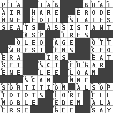 ACROSS 1. Parent Teacher Assoc. 4. Keyboard key 7. Naughty child 11. Atmosphere 12. Female horse 13. Wear away 14. Compass dir. 15. Prepare for publication 16. Chalkboards 17. Theater features 19. Helper 21. Cleo's killer 23. Angers 24. Butter sub 25. Ripen 26. Baseball player Mel 29. Obtain by seizing forcibly or violently 30. Followers of ems 31. Corporate head (abbr.) 32. Period 33. Big collection agency 34. Erode 35. Put into a specified state 36. _-fi 37. _ Allan Poe 40. Compass dir. 41. Area sheltered from the wind 42. Grant temporary use of 43. Glance over 45. Madame (abbr.) 46. Decision 51. Columnist Joseph or Stewart 55. Foolish or stupid persons 56. Australian parrot (variant) 58. Pipe bend 59. Having high moral qualities 60. Paradise 61. Chicken ___ king 62. Celtic language 63. Unit of force equal to gravity 64. Declare DOWN 1. Baking dishes 2. Prong on a fork 3. Type of rug 4. Bit 5. Roberta Peters solo 6. Wagers 7. Naughty children 8. Round or rotation of duties 9. An important port of Yemen 10. Trial 12. Makes clutter 13. Otherwise 16. Fathers 18. Falsehood 20. Omens 22. Plant holder 24. Speak pompously 25. Nest on high 26. Sea 27. Pull into pieces 28. Small child 29. Songbird 32. Compass dir. 33. Ancient Celtic tribe of eastern Britain 36. Narrow boards 37. Shade tree 38. Realm 39. Highlander 43. Fur scarf 44. Quote 46. Trig term 47. Aroma 48. Chest bones 49. Cassini of fashion 50. Thickened enlargement 52. Oceans 53. Rounded earthenware pot or jar 54. Romp 57. To separate or throw off