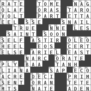 ACROSS 1. Assign a rank or rating to 5. Heavy book 9. Tired old horse 12. Norwegian king 13. Mouths or openings 14. Edible starchy tuberous root 15. Electrical Unit 16. Role in a play 17. Singer James 18. Snakelike fish 19. Compass dir. 21. Slow-paced one 22. Loyal 24. Compass dir. 26. French article 27. Virtuous person 28. Within a short period 29. Automatic 30. Having gotten out of bed 32. Margarine 36. The bottom of a shoe or boot 37. Greek goddess of the dawn 38. Foregone conclusion 39. Otherwise 40. Satellite of Uranus 42. 90 degrees 43. Drug cop 44. Speak pompously 46. Strand of rope, yarn or thread 49. Sound made by sheep 50. Hyperbolic tangent 51. Woody, climbing, usually tropical plant 53. Plant excrement 54. Environmental prefix 57. 1/640 square mile 58. Tenth: prefix 61. Demure 62. Posted 63. NW Algerian seaport 64. False hair 65. Mountains (abbr.) 66. Nathan's nickname 67. Arabian gulf DOWN 1. Be footloose 2. Medicinal plant 3. Baron Munchausen's specialties 4. Newt 5. Drink excessively 6. Mouth or opening 7. Spoil 8. Eastern Standard Time (abbr.) 9. Relating to or accompanying birth 10. Nick name for Arthur 11. Scores awarded for successful feats 14. "___ Little Indians" 19. Player for Phoenix 20. Stalk of a moss capsule 21. Elected rep. 23. Ransack; plunder; pillage 24. Annoying sound 25. And not 27. Stitch closed the eyes of (a falcon) 28. Unemotional 29. A female animal or person 31. Father Junipero _ 32. Sea 33. Resembling or made to resemble leather 34. Celtic language 35. Baseball player Mel 40. American Automobile Association (abbr.) 41. Globular water bottle used in Asia 43. Basketball assoc. 45. Reproach for some lapse or misdeed 46. Suffix with ecto or cyto 47. It is permitted: Lat. 48. Tall tales 52. Fish or hair follower 53. Trig term 55. Quote 56. Sign of things to come 58. Spanish title 59. Epoch 60. Domesticated feline 61. Parent Teacher Association (abbr.)