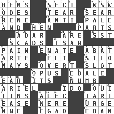 ACROSS 1. Cloth borders 5. Religious group 9. Compass dir. 12. Lyric poems 13. Pull apart 14. Dry up 15. French philosopher Descartes 16. Against 17. Diluted with white 18. Added to 19. Layer 21. Actors' quests 22. The sixth month of the Jewish calendar 24. "We ___ not amused" (Victoria) 26. Fast jet (abbr.) 27. Tons 28. Russian ruler of old 29. Ache 30. Maternal 32. Blind as ____ 36. Johnson of "Laugh-In" 37. Connecticut Ivy Leaguer 38. Grain storage tower 39. Negative votes 40. Unconcealed 42. Groove 43. Musical composition 44. Peak District village in England 46. Hearing organ 49. It is 50. Unfeeling 51. Satellite of Uranus 53. Wedding promise 54. Fr. "Yes" 57. Airtight sealed metal containers 58. Actor Baldwin 61. Small pie 62. Relaxation 63. Past tense of be (plural) 64. Goad 65. Compass dir. 66. Mild oath 67. Dutch treat DOWN 1. Israeli folk dance 2. Genesis locale 3. Ananias' fault 4. Compass dir. 5. Comedian Laurel of Laurel & Hardy 6. Car or cant ending 7. Domesticated feline 8. Three (prefix) 9. Erodes 10. Table seasonings 11. Obtain by seizing forcibly or violently 14. Health resort 19. Possessed 20. Celtic language 21. For each 23. Natives or inhabitants of Denmark 24. Moving or stirring 25. Actress Charlotte 27. "Two Mules for Sister ____" 28. Falsehoods 29. Baking dish 31. Congenital growth or mark on the skin 32. Indian state 33. Big road sign 34. Medicinal plant 35. Small child 40. Choose 41. Look after 43. Petroleum 45. Superhero pair 46. Ingested 47. Believer in; advocate of (suffix) 48. Remove soap 52. Compass dir. 53. On the rocks 55. Capital and largest city of Mongolia 56. Detail 58. Deep reverence 59. Part of a journey 60. Period 61. Third day of the wk.