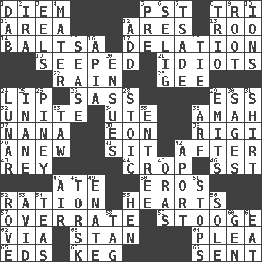 ACROSS 1. South Vietnam president (1954) 5. Pacific Standard Time (abbr.) 8. Three (prefix) 11. Type of rug 12. Ancient Greek god of war 13. Friend of Pooh 14. Greek mezzo-soprano Agnes 17. Accusation by an informer 19. Oozed 21. Foolish or stupid persons 22. Precipitation 23. Turn to the right 24. Mouth edge 27. Backtalk 29. Curvy letter 32. Join together 34. Shoshoni 36. Housemaid 37. Grandmother 38. A really long time 39. Swiss mountan, "Queen of the Mountains" 40. Afresh 41. Be seated 42. Following 43. Marina Del _, California 44. Riding implement 46. Fast jet (abbr.) 47. Had dinner 50. Greek god of love 52. Food allowance for one day 55. Centers of feelings and intuitions 57. Make much ado about nothing 59. Moe Howard, for one 62. By way of 63. Comedian Laurel of Laurel & Hardy 64. Entreaty 65. Begley and Asner 66. Cask 67. Posted DOWN 1. Pat or tap gently 2. Retirement account (abbr.) 3. Snakelike fish 4. Mother 5. Before (prefix) 6. Major League Baseball Commissioner Bud 7. Sadhe (variant) 8. Musical group of three 9. Carrot, for example 10. Charged particles 12. Say or write further 15. Gospel singer Marvin 16. Capital of Western Samoa 18. Standoff 20. Takes place subsequently 24. Type of eclipse 25. Empty; void 26. Abounding in pines 28. Unemotional 29. Sends forth 30. Gurus 31. Upper-body garment 33. The 23rd letter of the Hebrew alphabet 35. Main course 36. Sandy's bark 42. To the left, to Queeg 45. Mouths or openings 47. Wind 48. Cod relative 49. Maternal 51. Obstructs or blocks passage 52. Be footloose 53. Enthusiastic 54. Afternoon social gatherings 55. Layer 56. Flatfish 58. Label 60. Commissioned military rank (abbr.) 61. Erode