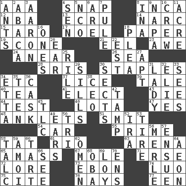 ACROSS 1. Auto club (abbr.) 4. Fastener 8. South American Indian 12. Basketball assoc. 13. Shade of tan 14. Drug cop 15. Pacific island yam 17. Christmas carol 18. Some stationery 19. Biscuitlike quick bread 21. Snakelike fish 23. Deep reverence 24. Approach 26. Ocean 28. Indian titles of respect 30. Paper fasteners 34. And so on (abbr.) 37. Louse (plural) 39. Lie 40. Afternoon social gathering 41. Opt 43. Pass on 44. Trial 46. Globular water bottle used in Asia 47. Affirmative reply 48. Short socks 51. Stricken, poetically 54. 4-wheeled motor vehicle 55. A-one 58. Make lace 61. River (Sp.) 63. Sports stadium 65. Collect or gather 67. Undercover agent 71. Celtic language 72. Old wives' tales, e.g. 73. Inky black, to poets 74. Nilotic language 75. Quote 76. Negative votes 77. Car or cant ending DOWN 1. Pismires 2. Phillipine bananalike plant 3. Composer Copland 4. Elected rep. 5. Non-commissioned officer (abbr.) 6. "We ___ not amused" (Victoria) 7. Whine 8. _ tizzy (2 wds.) 9. California wine valley 10. Ship's personnel 11. Land measure 16. Washington bills 18. Entreaty 20. Ewer handle 22. Eastern Standard Time (abbr.) 25. Cause heat under the collar 27. Fitting 29. Beverly of Met fame 30. Religious groups 31. Kenny Rogers chart-topper in '80 32. Writer Wiesel 33. Observes 34. Singer James 35. Adolescent 36. Keg 38. Corporate head (abbr.) 42. Pack (down) 45. Affectionate concern, for short 49. Hearing organs 50. Three (prefix) 52. Lyricist Gershwin 53. Become fatigued 56. Haggard of country music 57. Follow as a consequence or result 58. Baby powder 59. Mine, in Marseilles 60. Small pie 62. Sign of something about to happen 64. Period of immesurable duration 66. Observe 68. Chief or king in Benin or Nigeria 69. Myrna of the movies 70. Followers of ems