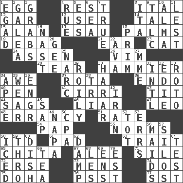 ACROSS 1. Oval reproductive body of a fowl 4. Relief 8. Slanted text style (abbr.) 12. Slender fish 13. One who uses or employs something 14. Lie 15. ____ Jay Lerner 17. He sold his birthright 18. Insides of hands 19. Debunk (Brit. slang) 21. Ewer handle 23. Feline 24. NE Netherlands city 26. Zeal 28. Lacerate 30. More given to overacting 34. Deep reverence 37. Roll call or roster of names 39. Inside; within (prefix) 40. Writing instrument 41. High-altitude cloud 43. Teat (slang) 44. Droops 46. One who doesn't tell the truth 47. Lion 48. Tendancy to err 51. Pace 54. Infant food 55. Typical models 58. It would 61. Groovy apt. 63. Distinguishing feature 65. Riviera of "Kiss of the Spider Woman" 67. Toward shelter 71. Drop; flow; fall 72. Celtic language 73. Not women's 74. Two (Sp.) 75. Capital of the state of Qatar 76. Inconspicuous attention getter 77. Fast jet (abbr.) DOWN 1. Mild oath 2. An organ shaped like a helmet 3. Takes hold of 4. Regret 5. Double-curved letter 6. Ocean 7. Loyal 8. Call ___ day 9. Baby powder 10. _ mater 11. For fear that 16. Political cartoonist Thomas 18. Demure 20. Turn to the right 22. Actress Gardner 25. Drug cop 27. Madame (abbr.) 29. Agitated, as a liquid 30. Ethiopian city, capital of Harari 31. International (abbr.) 32. Singer Brickell 33. Printing process, for short 34. Domed church section 35. Erode 36. Engineer (abbr.) 38. Three (prefix) 42. SW Asia republic 45. Plant excrement 49. California wine valley 50. Accounting whiz (abbr.) 52. Small child 53. Blunders 56. Unmarried girls 57. Grain storage towers 58. On the rocks 59. Through, poetically 60. Food container 62. Moist 64. Trial 66. Beverage made from leaves 68. French article 69. Followers of ems 70. Eastern Standard Time (abbr.)