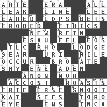 ACROSS 1. Johnson of "Laugh-In" 5. Period 8. Everything 11. Path through which fluid escapes 12. Citrus frut 14. Area sheltered from the wind 15. Having ears or earlike features 17. Chops off 18. Wagers 19. Worn away 21. Principles of right and wrong 23. ___ Haven, CT 25. It's straight from the horse's mouth 26. He sold his birthright 27. Snakelike fish 28. Greek goddess of the dawn 31. Affectionate concern, for short 33. 17th letter of the Greek alphabet 35. Cabin 37. Singe 38. RI univ. 40. Cause heat under the collar 41. Happen 43. Sis' sibling 45. Had dinner 46. Like a shrinking violet 47. Compass dir. 50. Arabian gulf 52. Soon (poet.) 53. Not either 54. Buttonhole 56. Cooks with dry heat, as in an oven 61. One of the Great Lakes 62. Celtic language 65. Snout, nose 66. Krazy ___ of comics 67. Observes 68. "Corrida" creature 69. Sight organ 70. Followers of ems 71. South American Indian DOWN 1. Toward shelter 2. Bring up, as a child 3. Edible starchy tuberous root 4. Supplemented with great effort 5. Pipe bend 6. _ de Janeiro 7. Electrical Unit 8. Actor Baldwin 9. Allows 10. French article 13. First name in cosmetics 16. Habitations of wild animals 18. Storage container 20. Letter starter 22. Land elevation 24. Chinese city south-southwest of Nanjing 26. Shade of tan 28. Prepare for publication 29. Stare at amorously 30. Observe 31. Technical 32. Made of lace 34. Globe 36. Northwest Algerian city 37. Distress signal 39. SW Asia republic 42. Western Nevada city 44. Scent 48. Olfactory organs 49. Main course 51. Greek god of love 52. Adept person 54. Like ___ of sunshine 55. Quote 57. Against 58. Within a short period 59. Torque (variant) 60. Portico 61. Make supply last 63. Elected rep. 64. Double-curved letter
