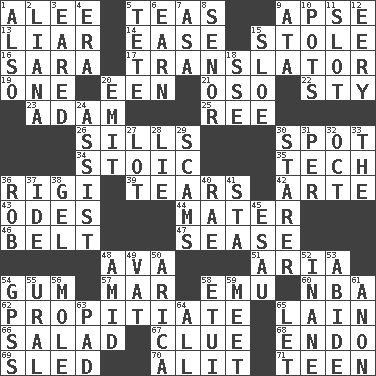ACROSS 1. Toward shelter 5. Afternoon social gatherings 9. Domed church section 13. One who doesn't tell the truth 14. Relaxation 15. Fur scarf 16. "Two Mules for Sister ____" 17. Interpreter 19. Single 20. Car or cant ending 21. Bear (Spanish) 22. Filthy place 23. First man 25. To riddle 26. Beverly of Met fame 30. Blemish 34. Unemotional 35. Georgia ____ (Atlanta school) 36. Swiss mountan, "Queen of the Mountains" 39. Lacerates 42. Johnson of "Laugh-In" 43. Lyric poems 44. Mother 46. Waist strap 47. Gospel singer Marvin 48. Actress Gardner 51. Operatic vocal solo 54. Chewing product 57. Make imperfect 58. Australian flightless bird 60. Basketball assoc. 62. Appease 65. (Had) reclined 66. Vegetable dish 67. A slight indication 68. Inside; within (prefix) 69. Downhill vehicle 70. Set down 71. Adolescent DOWN 1. In addition 2. Woody, climbing, usually tropical plant 3. Having ears or earlike features 4. Epoch 5. False hair 6. Merit 7. White ___ sheet 8. Sir (Sp.) 9. "One Day ___ Time" 10. Cooking vessels 11. Narrow opening 12. Suggestive of the supernatural 15. _ gin 18. Compass dir. 20. Give off 24. Help 27. Car dealer's back yard 28. Untruth 29. Fraudulent business schemes 30. A viewer who gazes fixedly 31. For each 32. Sep. follower 33. Definite Article 36. Director Reiner 37. Binary compound 38. Set 40. Actress Charlotte 41. R.R. building 45. Son of Isaac 48. Among 49. Large container 50. N. Chile seaport 52. Silly 53. Remain 54. Global Positioning Systems (abbr.) 55. Mountain range 56. Undercover agent 58. Needle holder 59. Rendezvous 61. At once, immediately (arch.) 63. Writing tablet 64. Everything 65. Allow