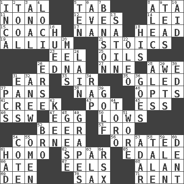ACROSS 1. Slanted text style (abbr.) 5. Keyboard key 8. _ moment's notice (2 wds.) 11. Words to Nanette 12. Nights before holidays 14. Flowery wreath 15. Team commander 17. Grandmother 18. Froth on beer 19. Plant genus of onion and garlic 21. Unemotional ones 23. Snakelike fish 25. Petroleums 26. Pulitzer Prize-winning author Ferber 27. Compass dir. 28. Deep reverence 31. Ewer handle 33. Title for a knight 35. Stared 37. Zero-star reviews 38. Tired old horse 40. Elects 41. Small stream 43. Plant holder 45. Curvy letter 46. Compass dir. 47. Ovum 50. Moos 52. Fermented drink made from hops 53. Back 54. Pupil covering 56. Declaimed 61. Same (prefix) 62. Practice fight 65. Peak District village in England 66. Had dinner 67. Snakelike fish 68. ____ Jay Lerner 69. Lair 70. Saxophone 71. Monthly bill DOWN 1. South American Indian 2. Utensil 3. Of or related to the anus 4. Venues 5. Nine, plus one 6. Actress Gardner 7. Gillaume's butler role 8. Actor Baldwin 9. Afternoon social gatherings 10. Assist 13. Smooth fabric 16. Took on color 18. Part of HMS, perhaps 20. Not women's 22. Margarine 24. (Had) reclined 26. Celtic language 28. High mountains 29. Soaks 30. Begley and Asner 31. Hearing organs 32. Afresh 34. Strike 36. Leaves 37. Personal Computers (abbr.) 39. Eighteen holes 42. Peachy ____! 44. "Corrida" creature 48. Honkers 49. Raisin fruits 51. Had on 52. Sis' sibling 54. ____ d'Azur (French Riviera) 55. Sign of something about to happen 57. The sixth month of the Jewish calendar 58. Lie 59. Flair 60. Undesirable depression on a surface 61. Possessed 63. According to 64. Acura sports coupe