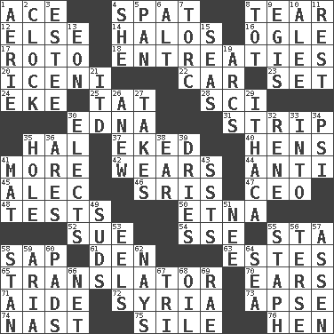 ACROSS 1. Adept person 4. Argument over a trivial matter 8. Rend 12. Otherwise 14. Rings 16. Stare 17. Printing process, for short 18. Pleas 20. Ancient Celtic tribe of eastern Britain 22. Auto 23. Put into a specified state 24. Make supply last 25. Make lace 28. _-fi 30. Pulitzer Prize-winning author Ferber 31. Remove all contents or possession from 35. Actor Linden 37. Supplemented with great effort 40. Coop moms 41. Greater amount 42. Puts on (as clothing) 44. Opposed to 45. Actor Baldwin 46. Indian titles of respect 47. Corporate head (abbr.) 48. Trials 50. Inactive volcano in Sicily 52. Institute legal proceedings 54. Compass dir. 55. R.R. building 58. Plant excrement 61. Lair 63. _____ Park, CO 65. Interpreter 70. Hearing organs 71. Assistant 72. Damascus' land 73. Domed church section 74. Political cartoonist Thomas 75. Drop; flow; fall 76. Layer DOWN 1. Nest on high 2. Timepiece 3. First name in cosmetics 4. A female animal or person 5. Baking dish 6. The first octave above the treble staff 7. Torque (variant) 8. Small child 9. The front part of a cuirass 10. Toward shelter 11. Take ten 13. Period of immesurable duration 15. Oceans 19. Curves 21. It would 26. Afresh 27. Receives possession of 29. New York city 30. Chooses 32. French philosopher Descartes 33. To the inside or interior of 34. Air pressure measure (abbr.) 35. Opening into or through something 36. Ancient Greek god of war 38. Hearing organ 39. Frees from moisture 41. Floor covering 43. Fast planes 49. Soap bubbles 51. Born 53. Snakelike fish 55. Staphylococcus 56. Laconic 57. NE Netherlands city 58. Comedian Laurel of Laurel & Hardy 59. Roberta Peters solo 60. Writing tablets 62. Negative votes 64. Ocean 66. Fish or hair follower 67. Three (prefix) 68. Petroleum 69. Actress Charlotte