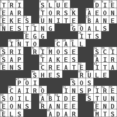 ACROSS 1. Three (prefix) 4. Turn sharply 8. Expire 11. Hearing organ 12. Cod relative 14. A really long time 15. Supplements with great effort 17. Join together 18. Object of repulsion 19. Inhabiting a nest 21. Scores awarded for successful feats 23. Ovum 24. It is 25. To the inside or interior of 27. Give a ring to 30. _ Lanka 31. Full of chinks, cracks, or crevices 34. _-fi 37. Plant excrement 38. Receives possession of 39. Wind 40. Followers of ems 41. Cause to be 43. Call ___ day 44. "______ My Girl" (Turtles hit) 45. General guideline 47. Luau course 49. Mayday 50. Capital of Egypt 52. Stimulate to action 56. The visible part of the earth's surface 57. Stay 60. Surprise greatly 61. Immeasurably long periods of time 62. Indian princess (variant) 63. Conclude 64. Raised railways 65. The sixth month of the Jewish calendar 66. Mountains (abbr.) DOWN 1. Adolescent 2. Libertine 3. Angers 4. Feeling sharp psychological pain 5. Yearn 6. RI univ. 7. Eastern Standard Time (abbr.) 8. Allots cards 9. Charged atoms 10. Compass dir. 13. Cask 14. Blind as ____ 16. Proofreading order 20. Composer Stravinsky 22. Petroleum 25. SW Asia republic 26. Cuts off 27. Popular sodas 28. Toward the sea 29. For fear that 30. Compass dir. 32. Hankering 33. Female horse 34. Travel by water 35. Quote 36. Retirement account (abbr.) 42. Greek god of love 44. Title for a knight 46. United States Postal Service (abbr.) 47. Aches 48. Lubricates 49. Scornful expression 50. Calm and collected 51. Boat paddle 52. The content of cognition 53. A distinct part 54. Undersized animal 55. Extremities 56. Observe 58. Sound made by sheep 59. Working for oneself (abbr.)