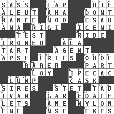 ACROSS 1. Backtalk 5. Pet locale 8. Pass on 11. Eskimo relative 13. Wet nurse (var.) 14. Do not 15. The wife of a rajah (variant) 16. Lower and raise head in agreement 17. He sold his birthright 18. Santa ___, CA 19. Swiss mountan, "Queen of the Mountains" 21. Ancient Celtic tribe of eastern Britain 22. Trial 24. Travel on or in a vehicle 25. Pressed 27. In the manner of 29. Small pie 30. Rep 32. Domed church section 33. Strips of potato fried in deep fat 35. Mitch Miller's instrument 39. More valued for its uncommonness 41. Role in a play 42. Myrna of the movies 43. Medicinal drug used to evoke vomiting 45. Mass 48. Keg 49. Titles for men of rank and authority 50. Proofreading order 52. Bit 55. "Terrible" tsar 56. Slender fish 57. Peak District village in England 59. Allows 60. One (Scot) 61. High-strength synthetic material 62. Compass dir. 63. Science/research agcy. 64. Makes supply last DOWN 1. "Two Mules for Sister ____" 2. Actor Alda or Thicke 3. Elected representatives 4. Institute legal proceedings 5. Austrian-born American filmmaker Fritz 6. Mine, in Marseilles 7. Groovy apt. 8. Administered medicine 9. Empty; void 10. Needle case 12. Laconic 14. Tenth: prefix 20. It would 21. SW Asia republic 23. Keyboard key 25. Call ___ day 26. Reproach for some lapse or misdeed 27. Grow older 28. French article 30. Wind 31. Drinks excessively 33. From 34. Marina Del _, California 36. Sass 37. Mouth or opening 38. And so on (abbr.) 40. High mountains 43. Frozen water 44. Eucharist need 45. Make or become more lively 46. A salt of uric acid 47. Not women's 49. Filth; sediment 50. Without 51. Unclean, religiously 53. _ vera 54. Cub Scout units 56. Separate the seeds from cotton 58. Color