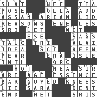 ACROSS 1. Narrow board 5. Born 8. Afternoon social gathering 11. Airs 12. Water jar 14. Increase 15. Indian state 17. Believer in; advocate of (suffix) 18. Flaplike covering 19. Thinks logically 21. Compass dir. 22. French article 23. Indian title of respect (Mr.) 24. Allow 25. Soggy 27. Compass dir. 28. Sinks 31. Baby powder 35. Three (prefix) 37. Jai ____ 38. It may be bright or harebrained 39. _-fi 41. Peachy ____! 42. Lightbulb-shaped fruit 43. Period 45. Capri or Wight 46. International (abbr.) 47. The grampus (Milton) 49. Being at a high temperature 51. Teachers' org. 52. Title for a knight 55. "We ___ not amused" (Victoria) 57. Grow older 60. Substance 62. Tavern 63. Ridiculed 65. Leg joints 66. Whopper 67. "Two Mules for Sister ____" 68. Undesirable depression on a surface 69. Conclusion 70. Was introduced to 71. Indian titles of respect DOWN 1. Practice fights 2. Failure 3. Slender Brazilian palm 4. Beverages made from leaves 5. And not 6. Writer Wiesel 7. Liveliness 8. Baron Munchausen's specialties 9. Singer Brickell 10. Sums up 13. Afresh 16. Undercover agent 17. Michaelmas daisies 20. Egg locale 26. 1973 Nobel Price Winner (Physics) Leo 29. Highlander 30. Trig term 31. Native american tent (variation) 32. An important port of Yemen 33. Resembling or made to resemble leather 34. Monte _, Las Vegas Hotel/Casino 36. Frozen water 40. Pressed 44. Ancient Greek god of war 48. Keg 50. Labels 52. Contemptuous expression 53. Ancient Celtic tribe of eastern Britain 54. Musical pauses 55. Competent 56. Precipitation 58. Island territory of the United States 59. Jane of fiction 61. Extremities 64. Consume