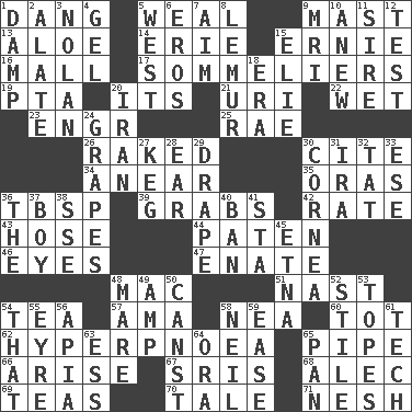 ACROSS 1. Mild oath, euphamism for damn 5. Welt 9. Vertical spar for supporting sails 13. Medicinal plant 14. One of the Great Lakes 15. Bert's buddy 16. Shopping center 17. Wine waiters 19. Parent Teacher Assoc. 20. ___ a Wonderful Life 21. RI univ. 22. Dripping 23. Engineer (abbr.) 25. Actress Charlotte 26. Swept the length of 30. Quote 34. Approach 35. Mouths or openings 36. Cook's measure (abbr.) 39. Catches 42. Pace 43. Stockings 44. Eucharist need 46. Snake ____ (dice throw) 47. Related on the mother's side 48. Apple computer (short form) 51. Political cartoonist Thomas 54. Beverage made from leaves 57. Nanny (var.) 58. Teachers' org. 60. Small child 62. Abnormally rapid or deep breathing 65. Corncob 66. Originate 67. Indian titles of respect 68. Actor Baldwin 69. Afternoon social gatherings 70. Lie 71. Delicate DOWN 1. Moist 2. Having winglike extensions 3. Pitcher Ryan 4. Set 5. 270 degrees 6. Greek god of love 7. Direct toward a target or goal 8. Arboreal primate 9. Medical imaging device (abbr.) 10. Afresh 11. Father 12. Trial 15. Writer Wiesel 18. Epoch 20. SW Asia republic 24. Raisin fruits 27. Barrel 28. Ewer handle 29. Window treatment 30. Pupil covering 31. Retirement account (abbr.) 32. Make lace 33. Compass dir. 36. Definite Article 37. Male child 38. Compass dir. 40. Forbid 41. R.R. building 45. Inactive volcano in Sicily 48. Female horse 49. Electrical Unit 50. 2nd pers. sing. pres. of can (arch.) 52. Vertical member of a panel or frame 53. Drinks excessively 54. Not this but _ 55. Jane of fiction 56. Capital of Western Samoa 58. Famous astronaut Armstrong 59. Relaxation 61. Technical 63. Double-curved letter 64. Mouth or opening 65. Baking dish