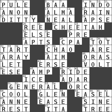 ACROSS 1. Whimper 5. Sound made by sheep 8. Southeast Asian peninsula 12. At once, immediately (arch.) 13. _ mater 15. Precipitation 16. Short, simple song 18. Be tempered by heat 19. Domed church section 20. Portuguese money of account (variant) 22. Leopard's kin 24. Otherwise 26. Before (prefix) 27. Tenement units (abbr.) 28. Accounting whiz (abbr.) 29. Small child 32. Small pie 35. US Secretary of Labor Elaine L. _ 37. "We ___ not amused" (Victoria) 38. Like ___ of sunshine 39. Direct toward a target or goal 40. Mouths or openings 41. Allow 42. Celtic language 43. Electrical Unit 44. Compass dir. 45. Electrical Unit 46. Travel on an animal 49. Frozen water 50. The sixth month of the Jewish calendar 51. Commissioned military rank 55. The grampus (Milton) 56. Calm and collected 57. Small, secluded valley 59. Artist's stand 63. Queen of England 1702-14 64. Relaxation 65. Trig term 66. Relief 67. Call ___ day 68. Family _ (genealogy) DOWN 1. Writing tablet 2. University (slang) 3. Car dealer's back yard 4. Plea 5. Prohibit 6. Actor Baldwin 7. Wet nurse 8. Feeling or showing extreme anger 9. California wine valley 10. Food container 11. Single 14. City in Syria 17. Sharp bark 21. Eastern Standard Time (abbr.) 23. Epoch 25. Fortification 28. Device for capturing images 29. Pacific island yam 30. Of the mouth 31. Trial 32. Falsehood 33. Ancient Greek god of war 34. Pace 36. Part of HMS, perhaps 40. Cloudy 42. Develop 45. Adept person 47. Wedding promise 48. Have the gumption 49. An arm off of a larger body of water 51. Went 52. Immeasurably long periods of time 53. Jai ____ 54. For fear that 56. Automobile 58. Teachers' org. 60. Title for a knight 61. Compass dir. 62. Area sheltered from the wind