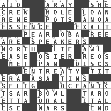 ACROSS 1. Help 4. Like ___ of sunshine 8. A female animal or person 11. Ship's personnel 13. Undercover agent 14. Grant temporary use of 15. French philosopher Descartes 16. Cooking vessels 17. Small Philippine buffalo 18. Substance 21. Glorify 22. Lightbulb-shaped fruit 23. Chief or king in Benin or Nigeria 25. To separate or throw off 26. "We ___ not amused" (Victoria) 29. Orators 32. 0 degrees 34. Untruth 35. Leather borer 38. Relaxation 39. Flexible twig of a willow tree 41. Vintage cars 43. Was introduced to 44. Baking dish 45. Plates 46. Plea 50. Teat (slang) 51. Period 54. White ___ sheet 55. Canisters 57. Former Milwaukee Brewers owner Bud 59. Pertaining to the sea 63. Russian ruler of old 64. Soup holder 67. Pacific island yam 68. Singer James 69. Spoken 70. Slanted text style (abbr.) 71. Compass dir. 72. Armed conflicts 73. Conclusion DOWN 1. 1/640 square mile 2. Angers 3. Lairs 4. Electrical Unit 5. Friend of Pooh 6. Keyboard modifier key 7. Consenting reply 8. Echolocation 9. White Person, in Hawaii 10. Maternal 12. Shed a tear 14. Not strict 19. Soft 20. Head covering 21. Ewer handle 23. Migrant worker of the '30s 24. Fermented drink made from hops 26. A saturated hydrocarbon 27. Wander aimlessly 28. Celtic language 30. Place in a line 31. Indian skirt 33. False hair 36. 270 degrees 37. Locales 39. Elects 40. "Two Mules for Sister ____" 42. Fast jet (abbr.) 45. Centimeter-gram-second unit of force 47. Tired old horse 48. Ringlike coral islands and reefs 49. Nervous spasm 51. First name in cosmetics 52. Musical pauses 53. Having winglike extensions 56. Suttee (variant) 58. Lyricist Gershwin 60. Nathan's nickname 61. SW Asia republic 62. Chilled 64. Arrow shooter 65. Mouth or opening 66. Armed conflict