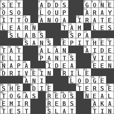 ACROSS 1. Arrange properly for use 4. Sums up 8. Went 12. Bear (Spanish) 13. Central Nebraska county 14. Like ___ of sunshine 15. "Tell ____ the Marines!" 17. Small Philippine buffalo 18. Feeling or showing extreme anger 19. Memorize 21. Scottish cap 23. French article 24. Broad, flat, thick pieces 26. Health resort 28. Without 30. Curse 34. Make lace 37. Actor Alda or Thicke 39. Assistant 40. Connecticut Ivy Leaguer 41. Leg coverings 43. Compete 44. California wine valley 46. It may be bright or harebrained 47. Car or cant ending 48. Popular '50s hangout 51. Cause heat under the collar 54. Cuckoo 55. Cabin 58. A female animal or person 61. Pass on 63. Laconic 65. Ancient Roman robes 67. Vintage cars 71. Anneal 72. Arab leader 73. Confederate soldiers (slang) 74. Alias (abbr.) 75. Trial 76. Narrow board 77. Shallow baking pan DOWN 1. Earth 2. _____ Park, CO 3. Add up to 4. Chicken ___ king 5. Spanish title 6. Superhero pair 7. Petty quarrel 8. Slender fish 9. Relating to the mouth 10. Nathan's nickname 11. Snake ____ (dice throw) 16. Mouths or openings 18. Body of Kaffir warriors 20. Basketball assoc. 22. Cleo's killer 25. Fastener 27. _ moment's notice (2 wds.) 29. Killed 30. Keyboard key 31. Hub of activity 32. Singer Brickell 33. Adolescent 34. Watch over 35. Having or resembling wings 36. Native american tent (variation) 38. Added to 42. Travel by water 45. Actress Gardner 49. Extremities 50. One more than two 52. Car dealer's back yard 53. Locale of original sin 56. Relatively large 57. 1973 Nobel Price Winner (Physics) Leo 58. Proofreading order 59. Residence 60. Armor plate that protects the chest 62. Blunders 64. Liveliness 66. Tate display 68. Snakelike fish 69. Chief or king in Benin or Nigeria 70. Fast jet (abbr.)