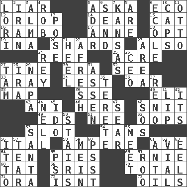 ACROSS 1. One who doesn't tell the truth 5. "____ silly question..." 9. Environmental prefix 12. Lowest deck of a ship 14. Letter starter 15. Feline 16. Role for Stallone 17. Queen of England 1702-14 18. Elect 19. _ tizzy (2 wds.) 20. Pottery fragments 23. In addition 24. Coral collection 25. 43,560 square feet 27. Prong on a fork 30. Epoch 32. Perceive with the eye 33. Like ___ of sunshine 34. For fear that 36. Boat paddle 38. Atlas unit 39. Compass dir. 40. Connecticut Ivy Leaguer 43. Black tropical American cuckoo 46. Possessive pronoun 48. In a ____ (agitated or irritated) 49. Begley and Asner 51. Born 52. I made a mistake 53. Narrow opening 54. Scottish caps 56. Slanted text style (abbr.) 58. Electrical Unit 61. "___ Maria" 64. "___ Little Indians" 65. Sliced desserts 66. Bert's buddy 68. Make lace 69. Indian titles of respect 70. "_____ Recall" 71. Mouth or opening 72. Is not 73. Petroleums DOWN 1. Australian parrot (variant) 2. SW Asia republic 3. _ mater 4. Director Reiner 5. The sixth month of the Jewish calendar 6. Transmit 7. Sunflower state 8. "We ___ not amused" (Victoria) 9. Learning spot: Fr. 10. Balmoral and tarboosh 11. "Beetle Bailey" pooch 13. Airs 21. The bottom of a shoe or boot 22. Anew 23. Type of rug 24. Marina Del _, California 26. Corporate head (abbr.) 27. Scottish cap 28. Retirement account (abbr.) 29. California wine valley 31. NE Netherlands city 35. Cylindrical with tapered ends 37. Western Nevada city 41. Mouth edge 42. ___ a Wonderful Life 44. 1994 drama film starring Jodie Foster 45. Wedding promise 47. Shrivel 48. Distress signal 50. Flight of steps 53. Before Barbara or Clara 55. Confront 56. "Tell ____ the Marines!" 57. Separate forcefully 59. Count _ (2 wds.) 60. Inconspicuous attention getter 61. Against 62. Small bottle 63. Snakelike fish 65. 23rd letter of the Greek alphabet 67. Friend of Pooh
