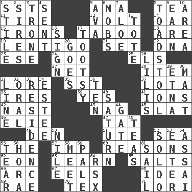 ACROSS 1. Fast planes 5. Housemaid (var.) 8. Afternoon social gathering 11. Hoop that covers a wheel 12. Electrical Unit 14. Rowing implement 15. Metal shackles 17. Off limits 18. "We ___ not amused" (Victoria) 19. Small, flat, pigmented spot on the skin 21. Arrange properly for use 22. Heredity factor (abbr.) 23. Compass dir. 24. Thick or sticky substance 25. Raised railways 27. Remaining after all deductions 28. A distinct part 31. Old wives' tales, e.g. 35. Fast jet (abbr.) 37. Globular water bottle used in Asia 38. Angers 39. It is so 41. Charged atoms 42. Political cartoonist Thomas 43. Tired old horse 45. Narrow board 46. Writer Wiesel 47. Make lace 49. Lair 51. Shoshoni 52. Ocean 55. Definite Article 57. Naughty child 60. Thinks logically 62. Period of immesurable duration 63. Acquire or gain knowledge or skills 65. Table seasonings 66. Curve 67. Snakelike fish 68. The main thing one is thinking about 69. Actress Charlotte 70. John Ritter's dad 71. Australian parrot (variant) DOWN 1. Vertical member of a panel or frame 2. Begets 3. Heavy duty weighing machine 4. Transmitted 5. Actress Gardner 6. Disorderly crowds 7. _ vera 8. Inedible or poisonous agaric 9. Merit 10. Type of rug 13. Carry 16. Attach a signature 17. Tootsie (variant) 20. Leaves 26. Ms. Damita and namesakes 29. Inactive volcano in Sicily 30. Vertical spar for supporting sails 31. Actor's bit 32. Relating to the mouth 33. Dwelling 34. First name in cosmetics 36. "___ Little Indians" 40. Titan orbits this 44. Yard entry 48. Beverages made from leaves 50. The longest river in the world 52. Twentieth part of a lira 53. Keyboard key 54. Slender Brazilian palm 55. Rend 56. Israeli folk dance 58. Rendezvous 59. Light colored 61. Travel by water 64. Acura sports coupe