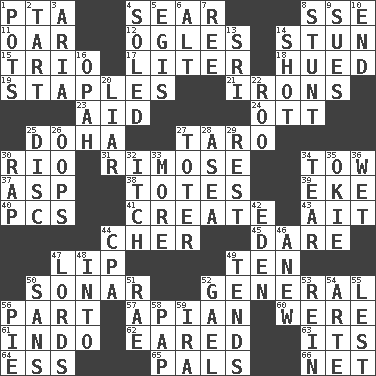 ACROSS 1. Parent Teacher Assoc. 4. Shrivel 8. Compass dir. 11. Boat paddle 12. Stares 14. Make senseless or dizzy 15. Musical group of three 17. 61 cubic inches 18. Took on color 19. Paper fasteners 21. Removes the wrinkles 23. Assist 24. Baseball player Mel 25. Capital of the state of Qatar 27. Edible starchy tuberous root 30. _ de Janeiro 31. Full of chinks, cracks, or crevices 34. Pull behind 37. Viper 38. Hauls 39. Supplement with great effort 40. Personal Computers (abbr.) 41. Make 43. Small island 44. "Mermaids" star 45. Have the gumption 47. Mouth edge 49. "___ Little Indians" 50. Underwater navigation system 52. Commissioned military rank 56. Piece 57. Bee-related 60. We are 61. _ china 62. Having ears or earlike features 63. ___ a Wonderful Life 64. Curvy letter 65. Friends 66. Remaining after all deductions DOWN 1. Plant holders 2. Small pie 3. Operatic vocal solo 4. Having a sole or soles 5. Armor plate that protects the chest 6. Keyboard modifier key 7. To sift 8. Check the growth or development of 9. Takes to court 10. Conclude 13. Indian title of respect (Mr.) 14. Opportunity 16. Brightly colored fish 20. One who doesn't tell the truth 22. Friend of Pooh 25. Compact _ 26. I made a mistake 27. Carrier 28. At sea 29. Take ten 30. Hit sharply and swiftly 32. Hankering 33. Greater amount 34. Separate forcefully 35. Migrant worker of the '30s 36. Dripping 42. Locale of original sin 44. Accounting whiz (abbr.) 46. Afresh 47. Titled peers of a realm 48. To the inside or interior of 49. Looks after 50. Without 51. Actress Charlotte 52. Highlander 53. It's straight from the horse's mouth 54. Johnson of "Laugh-In" 55. For fear that 56. Sliced dessert 58. Infant food 59. Lyricist Gershwin