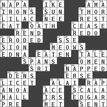 ACROSS 1. California wine valley 5. Mamie's husband 8. Wet nurse (var.) 11. Removes the wrinkles 13. Player for Phoenix 14. Son of Odin 15. Pale purple color 16. Born 17. Remainder 18. Consume 19. Pledge 21. Stop 22. Tear apart 24. Make new 25. Worn away 27. Compass dir. 29. The Jewish people; Israel 30. Catcalls? 32. Pulitzer Prize-winning author Ferber 33. Eroded 35. Story 39. Connects, as a bridge 41. Sign of something about to happen 42. Indian title of respect (Mr.) 43. Slept 45. Cub Scout units 48. Celtic language 49. It is permitted: Lat. 50. Jai ____ 52. Hit sharply and swiftly 55. Small Philippine buffalo 56. Adept person 57. Any of the three canals of the cochlea 59. Promenade 60. Big collection agency 61. _ Allan Poe 62. Before (prefix) 63. Was introduced to 64. Posted DOWN 1. The longest river in the world 2. Roberta Peters solo 3. Coward 4. Santa ___, CA 5. Is not 6. Malaysian steamed pastry 7. Compass dir. 8. Toward the future 9. With motion or animation 10. Johnson of "Laugh-In" 12. Biscuitlike quick bread 14. Relationship diagram 20. Say or write further 21. Group working together 23. Ferber et al. 25. Compass dir. 26. To free from 27. Observe 28. Boy, to dad 30. Mountains (abbr.) 31. Ceases 33. Hearing organ 34. Black tropical American cuckoo 36. Electrical Measurement 37. Area sheltered from the wind 38. Conclusion 40. Inconspicuous attention getter 43. Teachers' org. 44. Originate 45. Middle Eastern gold or silver currency 46. Learning spot: Fr. 47. Actress Patricia 49. Desk light 50. 43,560 square feet 51. For fear that 53. Actor Alda or Thicke 54. Piece 56. Direct toward a target or goal 58. Music discs