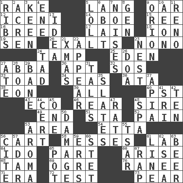 ACROSS 1. Libertine 5. Long (Scottish) 9. Rowing implement 12. Ancient Celtic tribe of eastern Britain 14. Mitch Miller's instrument 15. Portuguese money of account (variant) 16. A special lineage 17. (Had) reclined 18. Electrically charged atom 19. Elected rep. 20. Honors 23. Words to Nanette 24. Pack (down) 25. Locale of original sin 27. Swedish rock group 30. Fitting 32. Distress signal 33. Frog relative 34. Oceans 36. _ moment's notice (2 wds.) 38. A really long time 39. Everything 40. Pacific Standard Time (abbr.) 43. Environmental prefix 46. Posterior 48. The founder of a family 49. Conclusion 51. R.R. building 52. Ache 53. Length times width 54. Singer James 56. Heavy open wagon 58. Makes clutter 61. Experiment locale 64. Wedding promise 65. Component 66. Originate 68. Scottish cap 69. Legendary monster 70. The wife of a rajah (variant) 71. Period 72. Trial 73. Lightbulb-shaped fruit DOWN 1. Chest bones 2. Land measure 3. Peachy ____! 4. Compass dir. 5. Hang loosely or laxly 6. Blind as ____ 7. Annoying sounds 8. Commissioned military rank (abbr.) 9. Constellation of myth 10. Period of immesurable duration 11. Western Nevada city 13. It may be bright or harebrained 21. Dec. holiday 22. Seem 23. Egg locale 24. Small boy 26. ___ good deed 27. Had dinner 28. Surprise greeting 29. Object of repulsion 31. Stories 35. Chalkboards 37. Capital of Western Samoa 41. _ Lanka 42. "___ Little Indians" 44. Sure thing 45. Single 47. Assign a rank or rating to 48. Health resort 50. Break 53. Scent 55. Russian ruler of old 56. Quote 57. The sixth month of the Jewish calendar 59. Blunders 60. Proofreading order 61. Actor's bit 62. Toward the sea 63. Fermented drink made from hops 65. Plant holder 67. Reproach for some lapse or misdeed