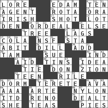 ACROSS 1. Old wives' tales, e.g. 5. Dutch treat 9. Nine, plus one 12. Representative 14. Roll call or roster of names 15. Mouth or opening 16. From or relating to Ireland 17. Went for two points 18. Car dealer's back yard 19. Lair 20. Severe or trying experience 23. Otherwise 24. Relationship diagram 25. Fails to keep up a pace 27. Root beer relative 30. Overdraft (abbr.) 32. R.R. building 33. "This won't hurt ____!" 34. Deli pickle 36. Say or write further 38. Scottish cap 39. Institute legal proceedings 40. Working for oneself (abbr.) 43. Help 46. Canisters 48. The main thing one is thinking about 49. Standoff 51. Spanish title 52. The Jewish people; Israel 53. Adolescent 54. Cause heat under the collar 56. Dormintory (informal) 58. Cigar-shaped 61. Actress Gardner 64. Auto club (abbr.) 65. Johnson of "Laugh-In" 66. High-strength synthetic material 68. It would 69. Western Nevada city 70. Started a card game 71. A female animal or person 72. Afternoon social gatherings 73. Sliced desserts DOWN 1. Put down 2. Legendary monster 3. It's straight from the horse's mouth 4. Followers of ems 5. Celtic language 6. Capital of the state of Qatar 7. Ringlike coral islands and reefs 8. Floor protector 9. For Whom the Bell _____ 10. Greek god of love 11. Nathan's nickname 13. Son of Odin 21. Tear apart 22. Cease 23. Mild oath 24. Make lace 26. "One Day ___ Time" 27. Domesticated feline 28. Chief or king in Benin or Nigeria 29. Pale green bean 31. Watery 35. Poe poem 37. "You Light Up My Life" star Conn 41. Modern: prefix 42. Daniel's nick name 44. Detail 45. Pass on 47. In a ____ (agitated or irritated) 48. Ending with capital 50. Main course 53. Swap 55. Grant temporary use of 56. Raised platform 57. Pledge 59. Inactive volcano in Sicily 60. Vintage cars 61. Jai _ 62. Short-tailed, large-bodied rat 63. Pismires 65. Tate display 67. Slangy assent