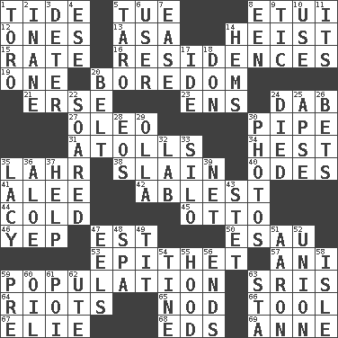 ACROSS 1. Periodic rise and fall of the sea level 5. Third day of the wk. 8. Needle holder 12. Washington bills 13. White ___ sheet 14. Robbery 15. Assign a rank or rating to 16. Homes 19. Single 20. Mood resulting from idleness 21. Celtic language 23. Followers of ems 24. Apply (a substance) by light strokes 27. Margarine 30. Corncob 31. Ringlike coral islands and reefs 34. Command 35. Cowardly lion portrayer 38. Killed 40. Lyric poems 41. Toward shelter 42. Most capable 44. Having a low temperature 45. "Beetle Bailey" pooch 46. Slangy assent 47. Eastern Standard Time (abbr.) 50. Son of Isaac 53. Curse 57. Black tropical American cuckoo 59. Census information 63. Indian titles of respect 64. Disturbances 65. Allow head to fall sleepily 66. Instrument 67. Writer Wiesel 68. Begley and Asner 69. Singer Murray DOWN 1. "Corrida" creature 2. Empty; void 3. Prevent from occurring 4. Compass dir. 5. Edible starchy tuberous root 6. One who uses or employs something 7. Relaxation 8. Car or cant ending 9. Nervous spasm 10. Purpose 11. ___ a Wonderful Life 14. Folds over and sews together 17. Binary compound 18. Spanish title 20. Waist strap 22. Flew 24. Passed on 25. Domed church section 26. Antes 28. Greek goddess of the dawn 29. Rounded earthenware pot or jar 30. Pictures 32. Experiment locale 33. Grain storage tower 35. Made of lace 36. Medicinal plant 37. Assist 39. Fish or hair follower 43. Proofreading order 47. Snakelike fish 48. Health resort 49. Teat (slang) 51. Composer Copland 52. The state of being joined or united 54. Prong on a fork 55. Parka part 56. Conclusions 58. Small island 59. Before (prefix) 60. Lubricate 61. Luau course 62. Shoshoni 63. R.R. building