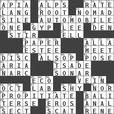 ACROSS 1. Capital of Western Samoa 5. High mountains 9. Pace 13. Long (Scottish) 14. Carrot, for example 15. Roamer 16. Drop; flow; fall 17. Form of transportation 19. Single 20. Swindle 21. Area sheltered from the wind 22. Lair 23. Move through with a circular motion 25. Pipe bend 26. Some stationery 30. Silent film actress Nazimova 34. First name in cosmetics 35. Rendezvous 36. Flat circle 39. Columnist Joseph or Stewart 42. Introduce or present, as a question 43. Roberta Peters solo 44. Sadhe (variant) 46. Drug cop 47. Underwater navigation system 48. Environmental prefix 51. Distinctive style or manner 54. Sep. follower 57. Experiment locale 58. Like a shrinking violet 60. And not 62. Conciliate 65. Indonesian resort city 66. Laconic 67. Greek god of love 68. Of or related to the anus 69. Religious group 70. Leave at once 71. French philosopher Descartes DOWN 1. In addition 2. Aches 3. An arm off of a larger body of water 4. Ripen 5. Like ___ of sunshine 6. Central Nebraska county 7. Plant holder 8. Fur scarf 9. Director Reiner 10. Among 11. Falsehood 12. Genesis locale 15. Christmas carol 18. Cartoonist voice _ Blanc 20. Pate de foie ____ 24. Medicinal drug used to evoke vomiting 27. Parent Teacher Association (abbr.) 28. Snakelike fish 29. Musical pauses 30. Electrical Unit 31. Lion 32. French article 33. Had dinner 36. Daniel's nick name 37. Lyricist Gershwin 38. Title for a knight 40. Bear (Spanish) 41. Baking dish 45. _ Jones' Locker 48. Writer Wiesel 49. Feline 50. Off-Broadway awards 52. Empty; void 53. Pitcher Ryan 54. Chooses 55. Algonquian 56. Torque (variant) 58. Portico 59. Command 61. Cause heat under the collar 63. Pacific Standard Time (abbr.) 64. Curve 65. Oblong piece of solid material