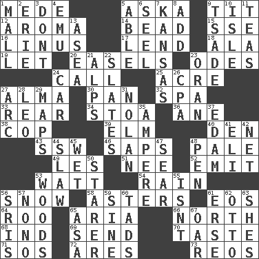 ACROSS 1. Ancient Persian 5. "____ silly question..." 9. Teat (slang) 12. Odor 14. Necklace unit 15. Compass dir. 16. "_ and Lucy" (Charlie Brown theme song) 17. Grant temporary use of 18. Insect wing 19. Allow 20. Artist's stands 23. Lyric poems 24. Give a ring to 25. 43,560 square feet 27. _ mater 30. Baking dish 32. Health resort 33. Posterior 34. Portico 36. A saturated hydrocarbon 38. Police officer (slang) 39. Shade tree 40. Lair 43. Compass dir. 46. Plant excrements 48. Diluted with white 49. French article 51. Born 52. Send forth 53. Electrical Unit 54. Precipitation 56. Overwhelm 58. Michaelmas daisies 61. Greek goddess of the dawn 64. Friend of Pooh 65. Operatic vocal solo 66. _ pole 68. Working for oneself (abbr.) 69. Post 70. Clothes sense 71. Distress signal 72. Ancient Greek god of war 73. Vintage cars DOWN 1. Promenade 2. One of the Great Lakes 3. Do not 4. Australian flightless bird 5. Competent 6. Stitch closed the eyes of (a falcon) 7. Sunflower state 8. Increase 9. Sadhe (variant) 10. Capri or Wight 11. Afternoon social gatherings 13. Toward the sea 21. High mountains 22. Chalkboards 23. NW Algerian seaport 24. Automobile 26. Numbers guy (abbr.) 27. Curve 28. Lion 29. Atlas contents 31. Pitcher Ryan 35. Electrical Unit 37. Dutch treat 41. Connecticut Ivy Leaguer 42. Fish or hair follower 44. Cole _ (cabbage dish) 45. Dripping 47. Scorch 48. Writing instrument 50. A viewer who gazes fixedly 53. Forest 55. Is not 56. Indian titles of respect 57. Words to Nanette 59. Trig term 60. Small boys 61. Celtic language 62. "Beetle Bailey" pooch 63. "______ My Girl" (Turtles hit) 65. White ___ sheet 67. Rowing implement