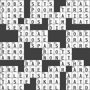 ACROSS 1. Disorderly crowds 5. Puts into a specified state 9. Welt 13. Mitch Miller's instrument 14. "Silly old bear" 15. Laconic 16. Actor's bit 17. Pleas 19. Car or cant ending 20. Begley and Asner 21. Shade tree 22. Consume 23. Stitched 25. Pass on 26. Perfect 30. Loose flowing garment 34. Trap for birds or small mammals 35. Mouths or openings 36. Mild oath 39. Practice fights 42. Measure of real estate 43. Former U.S. Attorney General Janet 44. Debaucheries 46. Afresh 47. Music written for nine 48. Strike 51. American tennis player Robert 54. Compass dir. 57. Single 58. Armed conflict 60. Also 62. Household entertainment appliance 65. Like ___ of sunshine 66. Clothes sense 67. Gumbo ingredient 68. Assign a rank or rating to 69. Actor Baldwin 70. Sew up the eyelids of hawks and falcons 71. Flintstone DOWN 1. Undercover agent 2. Off-Broadway awards 3. Maid-servant 4. Observe 5. Moved rapidly 6. Immeasurably long periods of time 7. Small child 8. Fragment 9. Soggy 10. One of the Great Lakes 11. Toward the sea 12. For fear that 15. Docile 18. Connecticut Ivy Leaguer 20. Inside; within (prefix) 24. Light entry point 27. Greek goddess of the dawn 28. Viper 29. Acquire or gain knowledge or skills 30. Exposes to great heat 31. The grampus (Milton) 32. Drinking establishment 33. Compass dir. 36. Period 37. Commissioned military rank (abbr.) 38. A saturated hydrocarbon 40. _ de Janeiro 41. Boy, to dad 45. Pull into pieces 48. Be footloose 49. Black tropical American cuckoo 50. Mexican monetary units 52. Ethiopian city, capital of Harari 53. Maternal 54. Singer James 55. Be tempered by heat 56. Otherwise 58. Had on 59. Of or related to the anus 61. Colored 63. And so on (abbr.) 64. Mamie's husband 65. Sandy's bark
