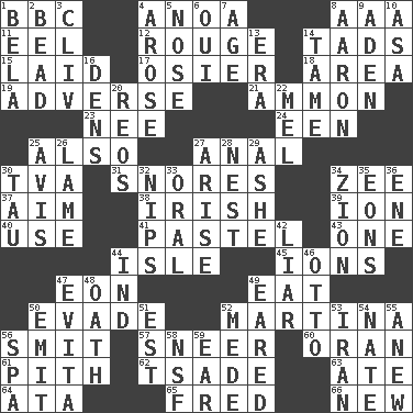 ACROSS 1. English channel? 4. Small Philippine buffalo 8. Auto club (abbr.) 11. Snakelike fish 12. Makeup applied to the cheeks 14. Bits 15. Put down 17. Flexible twig of a willow tree 18. Length times width 19. Contrary to your interests or welfare 21. ID or VA city 23. Born 24. Car or cant ending 25. In addition 27. Of or related to the anus 30. Federal power corp. 31. Sounds asleep 34. Last letter of the English alphabet 37. Direct toward a target or goal 38. From or relating to Ireland 39. Electrically charged atom 40. Purpose 41. Soft color 43. Single 44. Small island 45. Charged atoms 47. A really long time 49. Consume 50. Dodge 52. Chrissie's court nemesis 56. Stricken, poetically 57. Scornful expression 60. Northwest Algerian city 61. Essential or central part 62. Sadhe (variant) 63. Had dinner 64. _ moment's notice (2 wds.) 65. Flintstone 66. ___ Haven, CT DOWN 1. Actor Lugosi 2. Necklace unit 3. 154 in Roman numerals 4. Came up 5. Sense of smell 6. Fr. "Yes" 7. Mature 8. Composer Copland 9. Arabian gulf 10. White ___ sheet 13. Period 14. Docile 16. Lairs 20. Vintage cars 22. Cartoonist voice _ Blanc 25. Advice 26. Unable to walk 27. Originate 28. A home for chicks 29. American tennis player Robert 30. The 19th letter of the Greek alphabet 32. Cuts off 33. Of the mouth 34. The Jewish people; Israel 35. Immeasurably long periods of time 36. Compass dir. 42. One who doesn't tell the truth 44. Working for oneself (abbr.) 46. Von Bismarck 47. Webber/Rice musical 48. Pledge 49. Having ears or earlike features 50. Give off 51. Eastern Standard Time (abbr.) 52. Ancient Persian 53. SW Asia republic 54. Nathan's nickname 55. Afresh 56. Health resort 58. Science/research agcy. 59. Ewer handle