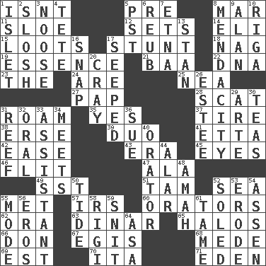 ACROSS 1. Is not 5. Before (prefix) 8. Spoil 11. _ gin 12. Puts into a specified state 14. Connecticut Ivy Leaguer 15. Plunders 17. Difficult or unusual or dangerous feat 18. Tired old horse 19. Core 21. Sound made by sheep 22. Heredity factor (abbr.) 23. Definite Article 24. "We ___ not amused" (Victoria) 25. Teachers' org. 27. Infant food 28. Jazz singing style 31. Wander 35. Consenting reply 37. Become fatigued 38. Celtic language 39. Superhero pair 41. Singer James 42. Comfort 43. Epoch 45. Sight organs 46. Sudden quick movement 47. In the manner of 49. Fast jet (abbr.) 51. Scottish cap 52. Ocean 55. Was introduced to 57. Big collection agency 60. Speakers 62. Mouth or opening 63. Middle Eastern gold or silver currency 65. Auras 66. Spanish title 67. Armor plate that protects the chest 68. Ancient Persian 69. Eastern Standard Time (abbr.) 70. Call ___ day 71. Locale of original sin DOWN 1. Small island 2. Splash clumsily 3. Trap for birds or small mammals 4. False hair 5. Pacific Standard Time (abbr.) 6. Reuben's nickname 7. Inactive volcano in Sicily 8. Ananias' fault 9. Actor Alda or Thicke 10. Port city in Latvia 13. Comedian Laurel of Laurel & Hardy 16. Fastener 17. Oozed 20. Supercomputer manufacturer 26. First name in cosmetics 29. Johnson of "Laugh-In" 30. Beverages made from leaves 31. Coral ridge 32. Relating to the mouth 33. Aide 34. Confronts 36. Take to court 40. Speaker 44. Having or resembling wings 48. Housemaid 50. Event that recurs at intervals 52. Having a sole or soles 53. Wear away 54. NE Netherlands city 55. Method 56. Greek god of love 58. Swiss mountan, "Queen of the Mountains" 59. In a ____ (agitated or irritated) 61. Docile 64. White ___ sheet
