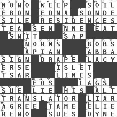 ACROSS 1. Words to Nanette 5. Shed a tear 9. The visible part of the earth's surface 13. Inky black, to poets 14. Pulitzer Prize-winning author Ferber 15. Message 16. Filth; sediment 17. Dwellings 19. Beverage made from leaves 20. Elected rep. 21. Compass dir. 22. Ingest 23. In a ____ (agitated or irritated) 25. Plant excrement 26. Typical standards 30. Moves up and down 34. Bee-related 35. Swedish rock group 36. Signal 39. Window treatment 42. Made of lace 43. Celtic language 44. Small island 46. Russian ruler of old 47. Citrus fruits 48. Greek goddess of the dawn 51. Fails to keep up a pace 54. Institute legal proceedings 57. Whopper 58. Part of HMS, perhaps 60. The first octave above the treble staff 62. Interpreter 65. One who doesn't tell the truth 66. Match 67. Docile 68. Writer Wiesel 69. Former U.S. Attorney General Janet 70. Takes to court 71. Unit of force DOWN 1. A home for chicks 2. Off-Broadway awards 3. Pitcher Ryan 4. Single 5. We are 6. Paradise 7. Followers of ems 8. Aches 9. Manchild 10. Single time 11. It may be bright or harebrained 12. For fear that 15. Ooze 18. Heredity factor (abbr.) 20. Discontinue 24. More lacking in sense or substance 27. To free from 28. Third mo. 29. Slow-paced one 30. Greek mezzo-soprano Agnes 31. Chief or king in Benin or Nigeria 32. English channel? 33. Declare 36. Put into a specified state 37. Big collection agency 38. Girls' org. (abbr.) 40. 23rd letter of the Greek alphabet 41. Shade tree 45. Snakelike fish 48. Otherwise 49. Petroleum 50. Theater features 52. Lightheartedly 53. Killed 54. Play the lead 55. Goad 56. Merit 58. Residence 59. Angers 61. Relationship diagram 63. Modern: prefix 64. The 19th letter of the Greek alphabet 65. Directed