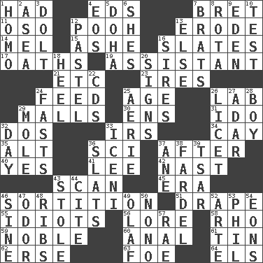 ACROSS 1. Possessed 4. Begley and Asner 7. Cy Young winner Saberhagen 11. Bear (Spanish) 12. "Silly old bear" 13. Eat (away) 14. Cartoonist voice _ Blanc 15. American tennis player Robert 16. Chalkboards 17. Profane or obscene expressions 19. Helper 21. And so on (abbr.) 23. Angers 24. Nourish 25. Personal question 26. Experiment locale 29. Shopping centers 30. Followers of ems 31. Wedding promise 32. Two (Sp.) 33. Big collection agency 34. Island 35. The first octave above the treble staff 36. _-fi 37. Following 40. It is so 41. Area sheltered from the wind 42. Political cartoonist Thomas 43. Examine minutely or intensely 45. Epoch 46. Conclusion 51. Window treatment 55. Foolish or stupid persons 56. Old wives' tales, e.g. 58. 17th letter of the Greek alphabet 59. Impressive in appearance 60. Of or related to the anus 61. Metal container 62. Celtic language 63. Enemy 64. Raised railways DOWN 1. Like (prefix) 2. Toward the sea 3. Stupid person 4. Greek goddess of the dawn 5. Capital of the state of Qatar 6. "______ My Girl" (Turtles hit) 7. Naughty children 8. Roll call or roster of names 9. Paradise 10. Trial 12. Soft color 13. Otherwise 16. Begets 18. The bottom of a shoe or boot 20. Attaches a signature 22. Music discs 24. Goes without food and/or water 25. Nest on high 26. It is permitted: Lat. 27. The sixth month of the Jewish calendar 28. Male child 29. Undercover agent 32. 24 hours 33. Ancient Celtic tribe of eastern Britain 36. Narrow boards 37. One (Scot) 38. Pack 39. Russian ruler of old 43. Fur scarf 44. Quote 46. Trig term 47. Scent 48. Chest bones 49. Norwegian king 50. Words to Nanette 52. Johnson of "Laugh-In" 53. Silvers or Donahue 54. Immeasurably long periods of time 57. Actress Charlotte