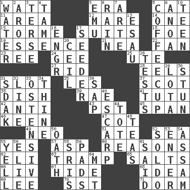 ACROSS 1. Electrical Unit 5. Epoch 8. Feline 11. Type of rug 12. Female horse 14. Single 15. Singer Mel 17. Costumes for special activities 18. Enemy 19. Substance 21. Teachers' org. 22. Air blower 23. To riddle 24. Unit of force equal to gravity 25. Shoshoni 27. To free from 28. Snakelike fish 31. Notch 35. French article 37. Native of Scotland 38. Food container 39. Actress Charlotte 41. Ballerina skirt 42. Against 43. Pacific Standard Time (abbr.) 45. Connect, as a bridge 46. Peachy ____! 47. Small bed 49. Modern: prefix 51. Had dinner 52. Ocean 55. Consenting reply 57. Viper 60. Thinks logically 62. Connecticut Ivy Leaguer 63. _____ steamer (cargo ship) 65. Table seasonings 66. 54 in ancient Rome 67. Flintstone garb 68. The main thing one is thinking about 69. Area sheltered from the wind 70. Fast jet (abbr.) 71. Dormintory (informal) DOWN 1. Wetness 2. Came up 3. Laconic 4. Docile 5. Australian flightless bird 6. Water falling in drops from the sky 7. Johnson of "Laugh-In" 8. Java holder (2 wds.) 9. Small Philippine buffalo 10. Adolescent 13. He sold his birthright 16. Engineer (abbr.) 17. Sowing specialist 20. To provide with a ceiling 26. Trials 29. Globular water bottle used in Asia 30. Astound 31. Neighbor of Neb. 32. Actor's bit 33. Clearly or manifestly demonstrative 34. One or ones belonging to thee 36. Plant excrement 40. Fortification 44. Carryall 48. Beverages made from leaves 50. Pledge 52. Twentieth part of a lira 53. Keyboard key 54. Indian state 55. Shout 56. Writer Wiesel 58. Indian titles of respect 59. Writing tablets 61. Alleged 64. Was introduced to