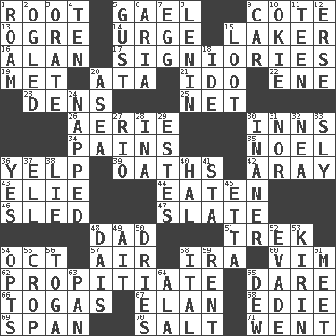 ACROSS 1. Carrot, for example 5. Highlander 9. ____ d'Azur (French Riviera) 13. Legendary monster 14. Goad 15. Member of a famous L.A. basketball team 16. ____ Jay Lerner 17. Seigniories (variant) 19. Was introduced to 20. _ moment's notice (2 wds.) 21. Wedding promise 22. Compass dir. 23. Cub Scout units 25. Remaining after all deductions 26. Nest on high 30. Taverns 34. Aches 35. Christmas carol 36. Sharp bark 39. Curses 42. Like ___ of sunshine 43. Writer Wiesel 44. Ingested 46. Downhill vehicle 47. Chalkboard 48. Male parent 51. Long journey 54. Sep. follower 57. Atmosphere 58. Retirement account (abbr.) 60. Zeal 62. Appease 65. Have the gumption 66. Ancient Roman robes 67. Enthusiasm 68. Singer Brickell 69. Connect, as a bridge 70. Table seasoning 71. Gone DOWN 1. Wander 2. Stared at amorously 3. Declaim 4. "___ Little Indians" 5. Abrupt rush of wind 6. Operatic vocal solo 7. Ovum 8. Soviet premier 1918-24 9. 4-wheeled motor vehicle 10. Migrant worker of the '30s 11. Adolescent 12. Celtic language 15. Plunder 18. Binary compound 20. Toward the sea 24. Slept 27. River (Sp.) 28. _ tizzy (2 wds.) 29. _____ Park, CO 30. More lacking in sense or substance 31. And not 32. Teachers' org. 33. Cunning 36. Affirmative reply 37. Pipe bend 38. Falsehood 40. Actor Linden 41. R.R. building 45. Singer James 48. Raised platform 49. Small island 50. Frees from moisture 52. Elude 53. Japanese brewing company 54. Elects 55. Riding implement 56. Ancient Roman robe 58. Slanted text style (abbr.) 59. Monthly bill 61. Rendezvous 63. Baking dish 64. Wing 65. Morning condensation