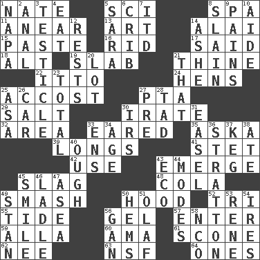 ACROSS 1. Nathan's nickname 5. _-fi 8. Health resort 11. Approach 13. Tate display 14. Jai _ 15. Thick mixture 16. To free from 17. Stated 18. Keyboard modifier key 19. Broad, flat, thick piece 21. One or ones belonging to thee 22. "Tell ____ the Marines!" 24. Coop moms 25. Buttonhole 27. Parent Teacher Assoc. 29. Table seasoning 30. Feeling or showing extreme anger 32. Type of rug 33. Having ears or earlike features 35. "____ silly question..." 39. Yearns 41. Proofreading order 42. Purpose 43. Develop 45. Volcanic refuse 48. Root beer relative 49. Box-office sellout 50. Parka part 52. Three (prefix) 55. Event that recurs at intervals 56. Set 57. Keyboard key 59. Silent film actress Nazimova 60. Nursemaid (var.) 61. Biscuitlike quick bread 62. Born 63. Overdraft (abbr.) 64. Washington bills DOWN 1. California wine valley 2. Of or related to the anus 3. A testis 4. Ingest 5. "Two Mules for Sister ____" 6. Baby bed with high sides 7. It would 8. Killed 9. Aches 10. Helper 12. Musical pauses 14. American tennis player Robert 20. Car dealer's back yard 21. Not this but _ 23. "_____ Recall" 25. White ___ sheet 26. 4-wheeled motor vehicle 27. Before (prefix) 28. Small amount or degree 30. Big collection agency 31. Artist's stand 33. Followers of ems 34. Grow older 36. Ski resort town in Vermont 37. Cask 38. Had dinner 40. Ending for "Through" and "Enough" 43. Environmental prefix 44. Methods 45. Grin 46. Dipping utensil 47. At sea 49. Comedian Laurel of Laurel & Hardy 50. Cloth borders 51. Norwegian king 53. French philosopher Descartes 54. Angers 56. Separate the seeds from cotton 58. Non-commissioned officer (abbr.)