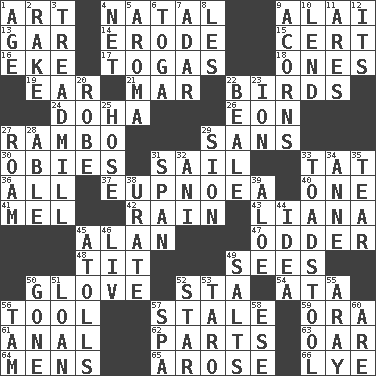 ACROSS 1. Tate display 4. Relating to or accompanying birth 9. Mountain range southwest of Kyrgyzstan 13. Slender fish 14. Wear away 15. Certainty 16. Supplement with great effort 17. Ancient Roman robes 18. Washington bills 19. Hearing organ 21. Third mo. 22. Avian creatures 24. Capital of the state of Qatar 26. Period of immesurable duration 27. Role for Stallone 29. Without 30. Off-Broadway awards 31. Travel by water 33. Make lace 36. Everything 37. Normal relaxed breathing 40. Single 41. Cartoonist voice _ Blanc 42. Precipitation 43. Climbing, woody, usually tropical vines 45. Actor Alda or Thicke 47. More peculiar 48. Teat (slang) 49. Observes 50. Michael Jackson trademark 52. R.R. building 54. "One Day ___ Time" 56. Instrument 57. Having lost freshness 59. Mouth or opening 61. Of or related to the anus 62. Actors' quests 63. Boat paddle 64. Not women's 65. Came up 66. Potassium hydroxide DOWN 1. Grow older 2. Immoral or dissolute person 3. Excercise machine 4. Fish or hair follower 5. Odor 6. Ancient Roman robe 7. The sixth month of the Jewish calendar 8. French article 9. Oak nuts 10. Grant temporary use of 11. Ancient Greek god of war 12. It is 20. Loose flowing garment 22. Calif. Air Force Base 23. Electrically charged atom 25. Stockings 27. Wander 28. Competent 29. The Jewish people; Israel 31. Connect, as a bridge 32. Cuckoo 33. Inedible or poisonous agaric 34. Queen of England 1702-14 35. Pull into pieces 38. A salt of uric acid 39. _ vera 44. The main thing one is thinking about 45. Ringlike coral islands and reefs 46. 54 in ancient Rome 49. Table seasonings 50. Went 51. Grant temporary use of 52. Play the lead 53. Pacific island yam 55. Like ___ of sunshine 56. Scottish cap 57. Health resort 58. Compass dir. 60. "We ___ not amused" (Victoria)