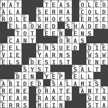 ACROSS 1. Floor protector 4. Beverages made from leaves 8. Margarine 12. According to 13. Spanish missionary in California 14. Chilled 15. Hero or heavy, e.g. 17. Imelda's hoard 18. Celtic language 19. Shoved, as through a crowd 21. Cast a shadow over 23. Small child 24. Car or cant ending 26. Followers of ems 27. Patter 28. Mouths or openings 30. Snakelike fish 31. Followed as a consequence or result 34. Pass on 37. Compete 38. Tall tales 39. Compass dir. 40. Raised railways 41. Stop 42. Compass dir. 43. System (abbr.) 44. Table seasoning 46. Lair 47. Slangy assent 50. Pipe bend 51. Tolerated 54. Deli grouping 57. French philosopher Descartes 58. Declaim 60. Opposed to 62. Separate forcefully 63. Moved through 64. Commissioned military rank (abbr.) 65. Blunders 66. Count _ (2 wds.) 67. R.R. building DOWN 1. Make imperfect 2. _ vera 3. Baron Munchausen's specialties 4. Giggle 5. Eat (away) 6. "We ___ not amused" (Victoria) 7. Backtalk 8. Seas 9. Domineers 10. Otherwise 11. Wrote a lyric poem 13. Compass dir. 16. Inky black, to poets 20. Baseball player Mel 22. Froth on beer 25. Parts of speech 27. To provide with a ceiling 29. Take ten 30. First lady 31. Snake ____ (dice throw) 32. Difficult 33. _ Lanka 34. Residences 35. Is not 36. She-sheep 41. Centimeter-gram-second unit of force 43. Spring feasts 44. Ocean 45. _ mater 46. Middle Eastern gold or silver currency 48. 1973 Nobel Price Winner (Physics) Leo 49. Eucharist need 51. Johnson of "Laugh-In" 52. Fermented drink made from hops 53. Dormintory (informal) 55. Directed 56. Proofreading order 59. Actress Charlotte 61. _ tizzy (2 wds.)