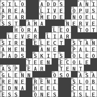 ACROSS 1. Grain storage tower 5. Does sums 9. Black tropical American cuckoo 12. Type of rug 13. Moving, as bait 14. Musical composition 15. Lightbulb-shaped fruit 16. Ancient Persian 17. Christmas carol 18. Fast jet (abbr.) 19. Nursemaid (var.) 21. Impudent aggressiveness 22. Israeli folk dance 24. Lion 26. Small child 27. Prying instrument 28. One who doesn't tell the truth 29. Beget 30. Opt 32. Comedian Laurel of Laurel & Hardy 36. So be it 37. One (Scot) 38. Light colored 39. Writing tablets 40. Burlesque acts 42. Margarine 43. Adolescent 44. Learning spot: Fr. 46. Viper 49. Ewer handle 50. Portable shelter 51. American astronaut and politician John 53. Bear (Spanish) 54. White ___ sheet 57. French philosopher Descartes 58. Painter Guido (1575-1642) 61. Oscar Madison type 62. Pulitzer Prize-winning author Ferber 63. The bottom of a shoe or boot 64. To provide with a ceiling 65. Curvy letter 66. Singles 67. Capri or Wight DOWN 1. Plant excrements 2. Angers 3. Tough but pliablecoriaceous 4. Boat paddle 5. _ mater 6. Expire 7. Movie disc 8. Observe 9. To the left, to Queeg 10. New (sp.) 11. Small island 14. Single 19. "We ___ not amused" (Victoria) 20. Female horse 21. And not 23. Baking chambers 24. It is permitted: Lat. 25. Ingest 27. Pale green bean 28. Soviet premier 1918-24 29. Plant excrement 31. Member of a famous L.A. basketball team 32. Soup utensil 33. Baron Munchausen's specialties 34. Toward shelter 35. Modern: prefix 40. Ocean 41. Puts into a specified state 43. Nine, plus one 45. Corporate head (abbr.) 46. Match 47. Bobsleighs 48. Actor Sean's family 52. Teachers' org. 53. Petroleums 55. Earth 56. Competent 58. 17th letter of the Greek alphabet 59. Car or cant ending 60. Born 61. _-fi