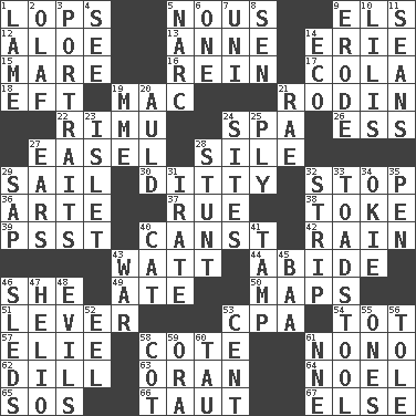 ACROSS 1. Chops off 5. Good sense 9. Raised railways 12. Medicinal plant 13. Singer Murray 14. One of the Great Lakes 15. Female horse 16. It's straight from the horse's mouth 17. Root beer relative 18. Newt 19. Big _ 21. "The Thinker" sculptor 22. Tall New Zealand timber tree 24. Health resort 26. Curvy letter 27. Artist's stand 28. Drop; flow; fall 29. Move on water 30. Simple song 32. Halt 36. Johnson of "Laugh-In" 37. Sorrow 38. Puff or smoke 39. Inconspicuous attention getter 40. 2nd pers. sing. pres. of can (arch.) 42. Precipitation 43. Electrical Unit 44. Remain 46. A female animal or person 49. Had dinner 50. Atlas contents 51. Crowbar 53. Numbers guy (abbr.) 54. Small child 57. Writer Wiesel 58. ____ d'Azur (French Riviera) 61. Words to Nanette 62. Deli pickle 63. Northwest Algerian city 64. Christmas carol 65. Mayday 66. Drawn tight 67. Otherwise DOWN 1. Unable to walk 2. Norwegian king 3. Likenesses of persons 4. Perceive with the eye 5. Drug cop 6. Single 7. Corn or form start 8. Elected rep. 9. Eat (away) 10. Ms. Damita and namesakes 11. Seines 14. Environmental prefix 19. Madame (abbr.) 20. Old (Scot.) 21. Actress Charlotte 23. Small island 24. Locates 25. Apply oneself diligently 27. Hearing organs 28. Difficult or unusual or dangerous feat 29. Plant excrement 31. Feeling or showing extreme anger 32. Remove all contents or possession from 33. Inedible or poisonous agaric 34. Migrant worker of the '30s 35. Fenced enclosure 40. Domesticated feline 41. Pack (down) 43. Armed conflict 45. Sound made by sheep 46. Bobsleighs 47. Sun: prefix 48. Vices 52. Snakelike fish 53. Penny 55. Washington bills 56. Lacquered or enameled metalware 58. Small bed 59. Mouth or opening 60. The 19th letter of the Greek alphabet 61. Compass dir.