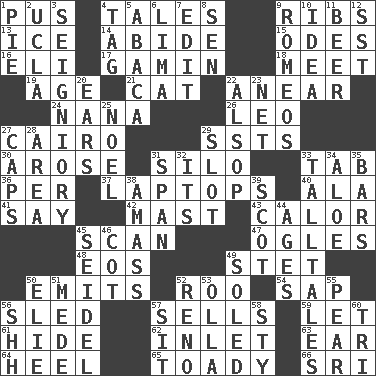 ACROSS 1. Product of festering 4. Stories 9. Teases 13. Frozen water 14. Remain 15. Lyric poems 16. Connecticut Ivy Leaguer 17. Homeless child 18. Rendezvous 19. Grow older 21. Domesticated feline 22. Approach 24. Grandmother 26. Lion 27. Capital of Egypt 29. Fast planes 30. Came up 31. Grain storage tower 33. Keyboard key 36. For each 37. Portable computers 40. Wing 41. Declare 42. Vertical spar for supporting sails 43. Bodily heat indicating an inflammation 45. Examine minutely or intensely 47. Stares 48. Greek goddess of the dawn 49. Proofreading order 50. Sends forth 52. Friend of Pooh 54. Plant excrement 56. Downhill vehicle 57. Exchanges for money 59. Allow 61. Flintstone garb 62. An arm off of a larger body of water 63. Hearing organ 64. The bottom of a shoe or boot 65. Sycophant 66. Indian title of respect (Mr.) DOWN 1. Sliced dessert 2. Southern CA. univ. 3. Signiory (variant) 4. Label 5. Phillipine bananalike plant 6. Pale green bean 7. Prepare for publication 8. Elected rep. 9. Lover boys 10. The content of cognition 11. Fermented drink made from hops 12. Fast jet (abbr.) 20. Hearing organs 22. Columnist Joseph or Stewart 23. Remaining after all deductions 25. Christmas carol 27. Smile enhancers 28. Type of rug 29. Narrow, elongated depression 31. Connect, as a bridge 32. ___ a Wonderful Life 33. Baron Munchausen's specialties 34. Medicinal plant 35. Taverns 38. Collect or gather 39. Native of Scotland 44. Ripens 45. A glass for beer 46. Small bed 49. Having a sole or soles 50. Writer Wiesel 51. Ancient Persian 52. Western Nevada city 53. Spanish pot 55. Lightbulb-shaped fruit 56. Quiet! 57. Be seated 58. Filthy place 60. Three (prefix)