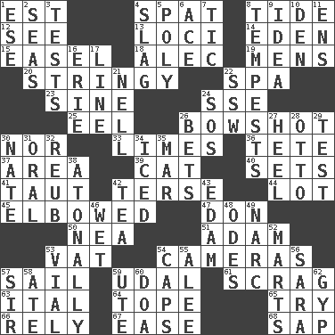 ACROSS 1. Eastern Standard Time (abbr.) 4. Argument over a trivial matter 8. Event that recurs at intervals 12. Perceive with the eye 13. Venues 14. Paradise 15. Artist's stand 18. Actor Baldwin 19. Not women's 20. Slender, wiry 22. Health resort 23. Trig term 24. Compass dir. 25. Snakelike fish 26. The distance a bow sends an arrow 30. Not either 33. Citrus fruits 36. Wig 37. Length times width 39. Feline 40. Puts into a specified state 41. Pulled tight 42. Laconic 44. Car dealer's back yard 45. Turned at an angle; bent 47. Spanish title 50. Teachers' org. 51. First of billions? 53. Large container 54. Devices for capturing images 57. Travel by water 59. Allodial 61. Lean end of the neck 63. Slanted text style (abbr.) 64. Drink excessively 65. Attempt to accomplish something 66. Trust 67. Comfort 68. Plant excrement DOWN 1. Compass dir. 2. Oceans 3. Trials 4. Volcanic refuse 5. Much (prefix) 6. Adept person 7. Nervous spasm 8. Storms 9. The main thing one is thinking about 10. Lair 11. Followers of ems 16. 4th largest of the Great Lakes 17. Actor's bit 21. 1994 drama film starring Jodie Foster 22. Compass dir. 24. Mayday 26. Stakes 27. The bottom of a shoe or boot 28. "Beetle Bailey" pooch 29. Trial 30. Nathan's nickname 31. Of the mouth 32. Reuben's nickname 34. On the rocks 35. Spoil 38. Lacking a tonal center or key 42. Afternoon social gathering 43. Dutch treat 46. Soggy 48. Lyric poems 49. Drug cop 52. Shops 53. Small bottle 54. Smile enhancers 55. Toward shelter 56. "Two Mules for Sister ____" 57. Title for a knight 58. Had dinner 59. Shoshoni 60. ___ good deed 62. Swindle