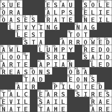 ACROSS 1. Take to court 4. He sold his birthright 8. Not divided or shared with others 12. Mouth or opening 13. High mountains 14. Writer Wiesel 15. Fertile tracts in a desert 18. Pace 19. Famous astronaut Armstrong 20. Imposing or collecting, as a tax 22. Tired old horse 23. For fear that 24. Small child 25. R.R. building 26. Moved like an arrow 30. Leather borer 33. Containing lumps 36. Redecorate 37. Spoils 39. _ Lanka 40. Expressed in words 41. Johnson of "Laugh-In" 42. Bee-related 44. Directed 45. Thinks logically 47. Chief or king in Benin or Nigeria 50. Bit 51. Immeasurably long periods of time 53. Wind 54. Manned the helm 57. Baby powder 59. Hearing organs 61. Founders of families 63. Tending to cause great harm 64. Travel by water 65. Actress Charlotte 66. Nathan's nickname 67. Not wild 68. "We ___ not amused" (Victoria) DOWN 1. "Barney Miller" actor Jack 2. Mountain range 3. Artist's stand 4. Merit 5. Volcanic refuse 6. Fitting 7. Purpose 8. Elected representatives 9. Cassini of fashion 10. Cards in a Roman deck? 11. Snakelike fish 16. Nights before holidays 17. System (abbr.) 21. Slanted text style (abbr.) 22. Not either 24. Attempt to accomplish something 26. Capital of Western Samoa 27. Welt 28. Singer Brickell 29. Texas town _ City 30. Having or resembling wings 31. Had on 32. Globular water bottle used in Asia 34. United States Postal Service (abbr.) 35. Medical imaging device (abbr.) 38. A testis 42. Added to 43. Christmas carol 46. Boat paddle 48. Scornful sounds 49. Opposed to 52. Father Junipero _ 53. Set down 54. Demure 55. Small island 56. Letter starter 57. Nine, plus one 58. Actress Gardner 59. Eastern Standard Time (abbr.) 60. American Automobile Association (abbr.) 62. Observe