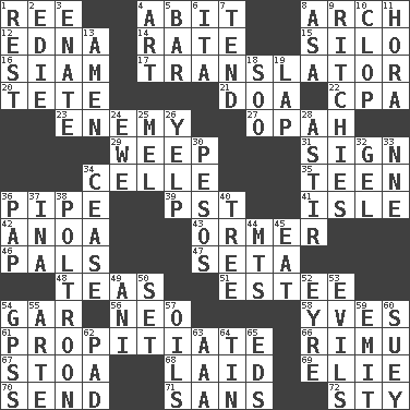 ACROSS 1. To sift 4. "This won't hurt ____!" 8. Bowlike part 12. Pulitzer Prize-winning author Ferber 14. Assign a rank or rating to 15. Grain storage tower 16. Thailand, formerly 17. Interpreter 20. False hair 21. ___ good deed 22. Numbers guy (abbr.) 23. Foe 27. Brightly colored fish 29. Shed a tear 31. Public display of a written message 34. Cell (Danish) 35. Adolescent 36. Corncob 39. Pacific Standard Time (abbr.) 41. Small island 42. Small Philippine buffalo 43. Abalone 46. Friends 47. Bristle 48. Beverages made from leaves 51. First name in cosmetics 54. Slender fish 56. Modern: prefix 58. Jacques Cousteau's middle name 61. Appease 66. Tall New Zealand timber tree 67. Portico 68. Put down 69. Writer Wiesel 70. Transmit 71. Without 72. Filthy place DOWN 1. Relief 2. Singer Brickell 3. Maternal 4. Tate display 5. Drinking establishment 6. Call ___ day 7. Look after 8. White ___ sheet 9. Actors Guy, Robert Welles, and Clint 10. Hoof sound 11. Israeli folk dance 13. So be it 18. "Barney Miller" actor Jack 19. Infant locale 24. She-sheep 25. Cartoonist voice _ Blanc 26. Sharp bark 28. Moving or stirring 30. Mexican monetary units 32. Set 33. Compass dir. 34. Stop 36. Infant food 37. _ tizzy (2 wds.) 38. Characterized by complete cowardliness 40. Woody plant 44. Mountains (abbr.) 45. Ingest 49. Cuckoo 50. Arrange properly for use 52. Jane of fiction 53. Vices 54. Global Positioning Systems (abbr.) 55. Johnson of "Laugh-In" 57. Lubricates 59. Give off 60. Chop _ 62. Writing tablet 63. Auto club (abbr.) 64. Shallow baking pan 65. Begley and Asner