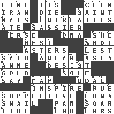 ACROSS 1. Citrus frut 5. It is 8. Clement's nick name 12. SW Asia republic 13. Expire 14. Virtuous person 15. Floor protectors 16. Pleas 19. Had dinner 20. More impudent 21. Celtic language 23. Heredity factor (abbr.) 24. A female animal or person 27. Behest 30. Went for two points 31. Michaelmas daisies 34. For fear that 35. Alleged 38. Approach 40. At sea 41. Queen of England 1702-14 42. Stop 44. Gilt 45. Not divided or shared with others 46. Declare 47. Atlas unit 50. Hereditary estate 53. Motivate 57. Sorrow 59. Supplementary 63. Pulitzer Prize-winning author Ferber 64. Slow-paced one 65. Baking dish 66. Fly high 67. Periodic rise and fall of the sea level 68. Conclusion 69. Blunders DOWN 1. Pale green bean 2. Feeling or showing extreme anger 3. Mother 4. Followers of ems 5. It may be bright or harebrained 6. Canisters 7. Arranges properly for use 8. Domesticated feline 9. Cards in a Roman deck? 10. Compass dir. 11. Mountains (abbr.) 14. "Two Mules for Sister ____" 17. To free from 18. Car or cant ending 20. Observes 22. Cast a shadow over 24. "______ My Girl" (Turtles hit) 25. Stockings 26. Singer James 28. R.R. building 29. Look after 30. Scheduled 32. Portuguese money of account (variant) 33. Backtalk 35. Settles 36. Small Philippine buffalo 37. In an inward manner 39. _ de Janeiro 43. Turn sharply 47. Place where flour is made 48. One (Scot) 49. Pacific Standard Time (abbr.) 51. Zeal 52. Type of eclipse 54. Corncob 55. _ the terrible 56. Tear apart 58. Hearing organs 59. Fast jet (abbr.) 60. University (slang) 61. Groovy apt. 62. Sliced dessert 63. Compass dir.